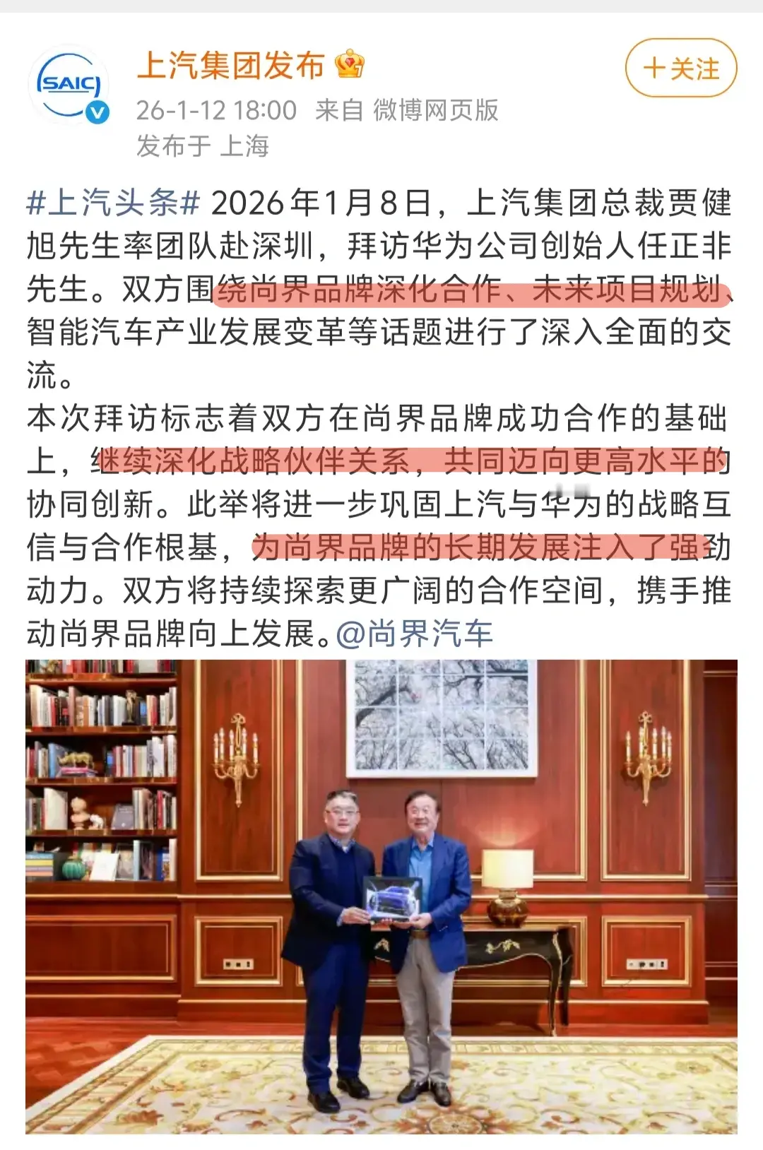 华为尚界居然连掩饰都不掩饰了, 直接对标曾经被小米雷军致敬的保时捷, 尚界Z7外观绝对不输SU7。 把外观作为王道展现的淋漓尽致。 2026年1月日官宣Z7,估计春季上市 2026年1月8日,上汽集团总裁贾健旭先生率团队赴深圳,拜访华为公司创始人任正非先生。 这时间卡的,上汽这次是真的服了,绝对是抛弃了曾经的灵魂论 年初就如此匆忙去拜访任正非先生, 这不仅是一种尊重,更是一种态度: 上汽这次是真的要紧跟华为的步伐,绝对是“ALL IN”! “双方围绕尚界品牌深化合作、未来项目规划智能汽车产业发展变革等话题进行了深入全面的交流。 本次拜访标志着双方在尚界品牌成功合作的基础上,继续深化战略伙伴关系,共同迈向更高水平的协同创新。此举将进一步巩固上汽与华为的战略互信与合作根基,为尚界品牌的长期发展注入了强劲动力。双方将持续探索更广阔的合作空间,…” Z7车型不仅仅致敬保时捷 ,更是把价格瞄准20万-30万区间,和小米SU7、特斯拉Model 3等一争高下。 今年的新能源市场绝对是热闹非凡。