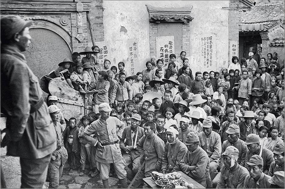 这张照片拍摄于1940年9月河北省涞源县杨家庄,真实记录了八路军干部向一批日伪军