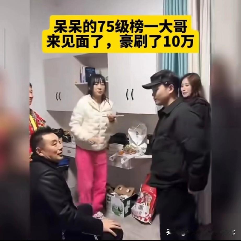 榜一大哥刷10万就为了见呆呆妹一面! 重庆合川呆呆妹的75级榜一大哥终于露脸了!这位豪掷10万的大哥亲自登门见面,本以为是场暖心的线下相聚,结果看完视频直接让网友炸了锅。 视频里大哥和呆呆妹一行人互动,临走时呆呆妹愣是没起身送一步,连句客套的送别话都没有。有知情网友说大哥前前后后给她刷了几十万,换来的却是这般冷遇,难怪有人吐槽她“呆呆”真是名不虚传,活脱脱一个呆瓜。