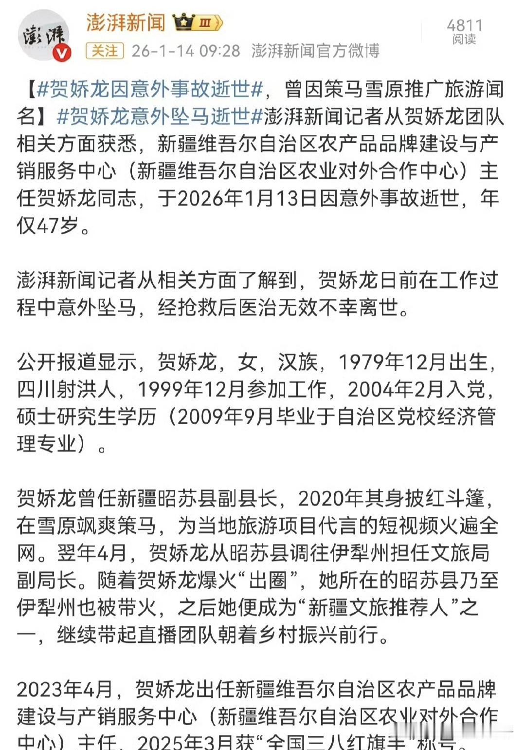 新疆“网红干部”贺娇龙坠马去世! 1月14日,一大早,看到贺娇龙去世的消息,让人颇感意外。 据媒体报道,贺娇龙在工作过程中意外坠马,经抢救后医治无效不幸离世,年仅47岁! 看过以往的视频,贺娇龙驰骋在草原上策马扬鞭,身姿飒爽,想必骑马技术很不错,万万没想到,会意外坠马,让人惋惜。 说实话,一直以来对网红并没有太好的印象,不过,这位“网红干部”不太一样,一心助农,为家乡宣传,工作尽心尽力,深受网友的喜爱,作为路人,听到去世的消息,也很难过。 如此敬业和优秀,生命却定格在47岁,只能说,天妒英才。 愿逝者安息,一路走好!