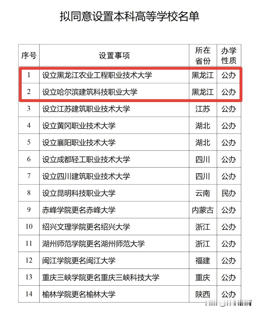 教育部正式公示:黑龙江新增2所公办本科院校![庆祝][庆祝] 1月12日,教育部公布关于拟同意设置本科高等学校的公示。 根据《中华人民共和国高等教育法》《普通高等学校设置暂行条例》《普通本科学校设置暂行规定》《本科层次职业学校设置标准(试行)》等有关规定,经教育部党组会议审议,拟同意设置黑龙江农业工程职业技术大学、绍兴大学等14所学校,现予公示。[ok] “黑龙江农业工程职业学院”和“黑龙江建筑职业技术学院”2所学校都属于“双高”计划高校,在去年也就是2025年4月份、黑龙江省教育厅就相序公示将更名职业本科大学,黑龙江农业工程职业学院更名为“黑龙江农业工程职业技术大学”、黑龙江建筑职业技术学院更名为“哈尔滨建筑科技职业大学”。 但因为教育部没有公示,25年就没有在本科招生,今年教育部已经公示,2026中低分考生也多了2所公办本科院校的选择。[给力][比心][比心]