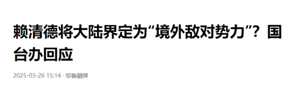 赖清德表示,大陆称“中华人民共和国台湾省”,把台湾说成是中国一部分,这样“吞并”台湾“主权”,是“境外敌对势力”。 在两岸关系不断紧张的情况下,这位台湾领导人突然发表这样的言论,把对岸称为“境外敌对势力”,还称对方想要吞并台湾的主权,这到底是出于政治手段,还是隐藏着更大的危机? 2025年3月13日,赖清德在所谓“国安高层会议”上首次将大陆明确定义为“境外敌对势力”,并抛出应对所谓“五方面威胁”的“17项策略”。 这一论调并非临时起意,而是其长期坚持“台独”立场的必然结果。早在2024年5月的就职讲话中,赖清德就宣称两岸“互不隶属”,奠定了这次激进论述的基础。 将大陆称为“境外敌对势力”,赖清德意图实现三重战略目标:其一,在法理上切割台湾与大陆的联系,为后续“法理台独”铺路;其二,在岛内制造“绿色恐怖”,打压统派声音,转移执政不力带来的内部压力;其三,向外部干预势力递交“投名状”,换取更多政治支持。 这种论调充分暴露了赖清德对国际格局和两岸关系的双重误判,他错误地认为当前国际局势动荡为“台独”提供了战略窗口,同时低估了大陆维护国家统一的决心和能力。 从历史和法律角度看,赖清德的“境外敌对势力”论调完全站不住脚。二战期间的《开罗宣言》、《波茨坦公告》以及《日本投降条款》等国际法律文件,已从国际法理上明确了台湾从日本殖民者手上归还中国的主权归属问题。 联合国大会第2758号决议更是确认了中华人民共和国政府是全中国的唯一合法代表。 一个中国原则是国际社会的普遍共识,也是台海和平稳定的基石。坚持这一原则,两岸关系就能改善发展,台海就能保持和平稳定;背离这一原则,台海形势就会紧张动荡,台湾民众的利益福祉就会严重受损。 赖清德的行为类似于历史上的分裂主义者,总是错误估计形势,幻想外部势力会为其提供实质性支持。正如美国《时代》杂志所指出的,正是因为赖清德“鲁莽又高调”,台湾才成为“最危险的引爆点”。 在将大陆定义为“境外敌对势力”后,赖清德加速推进“以武谋独”路线,2025年,台湾地区防务预算大幅增加至GDP的3%以上,并计划到2030年提高至5%。 这意味着未来几年台湾将额外投入1.25万亿元新台币用于军购,相当于每个台湾民众负担超过5万元。 这种军事冒险主义存在三大致命误判:首先,两岸军事实力差距悬殊,不是通过增加军购就能弥补的;其次,美国对台军售主要是为了自身经济利益,而非真正关心台湾安全;最后,过度军事化只会加剧台海紧张局势,将台湾推向战争边缘。 更具危险性的是,赖清德当局推动恢复已废止十余年的军事审判制度,未来若军人涉及所谓“叛乱”“间谍”等案件,即可“交由军事法院审判”。这一措施与“17项策略”中的其他内容相配合,正在将台湾推向“准戒严状态”。 赖清德当局强推两岸经济“脱钩断链”,已经给台湾经济带来严重负面影响,2024年,台湾地区经济增长率仅为1.2%,创十年新低;青年失业率突破12%,民生问题积重难返。 在赖清德的政策导向下,台湾对大陆出口额同比下降23%,半导体等支柱产业因失去大陆市场而面临产能过剩危机。 更令人担忧的是,赖清德当局不惜将以台积电为代表的台湾核心优势产业向美国转移,这种经济上的“自残行为” 将严重损害台湾的长期竞争力。 台湾民众的血汗钱本可用于发展经济、改善民生,却被赖清德当局用来购买二手武器装备,投入毁台害台的无底洞。 面对赖清德的挑衅行为,大陆保持了战略定力,同时做好了充分准备。大陆方面明确指出,赖清德的言行已触及《反分裂国家法》的红线,如果“台独”分裂势力胆敢突破红线,大陆将不得不采取断然措施。 在军事层面,解放军已具备全时空、全方位应对台海局势的能力,2025年12月,解放军东部战区组织“正义使命-2025”演习,覆盖台湾海峡、台岛北部、西南、东南和以东海域,展示了捍卫国家主权和领土完整的强大能力。 近年来推出的“两岸融合发展示范区”政策,已为台胞提供同等待遇条款187项,台湾企业享受税收优惠超千亿元。大陆方面强调,只有承认“九二共识”,认同两岸同属一个中国,两岸关系才能改善发展。 赖清德将大陆称为“境外敌对势力”,是其“台独”迷梦的又一次集中体现。这种言论不仅违背历史和法律事实,更将台湾推向兵凶战危的险境。 从战略角度看,赖清德的冒险行为建立在多重误判之上:他误判了国际形势,误判了大陆决心,误判了台湾民意,也误判了外部势力的可靠性。 台海和平稳定符合两岸人民的根本利益,也是国际社会的普遍期待。实现这一目标的关键在于坚持一个中国原则和“九二共识”,反对任何形式的“台独”分裂活动。 只有回归这一正确轨道,台湾才能真正享有和平与发展,两岸同胞才能携手共创民族复兴的美好未来。