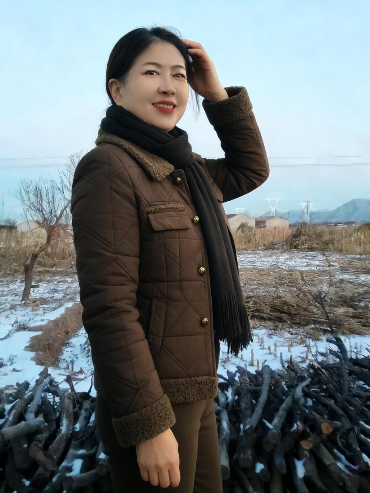 朔风卷雪满野丘,寒日苍苍照远畴。 棕褐棉衣遮瘦影,玄色围巾绕玉头。 荒林树秃栖寒鸟,野岸冰凝卧浅流。 独立田埂凝睇久,故园风物总牵愁。