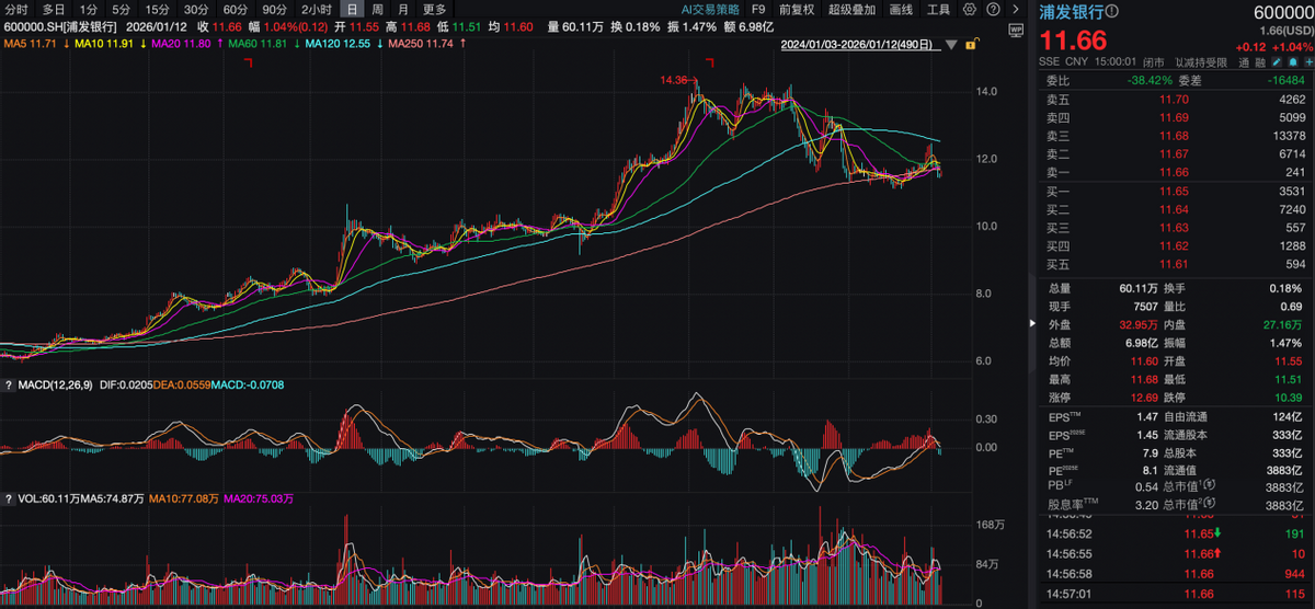 截至1月12日,浦发银行的股价报收于11.66元/股,较前期高点下挫18.8%,市值为3883亿元。