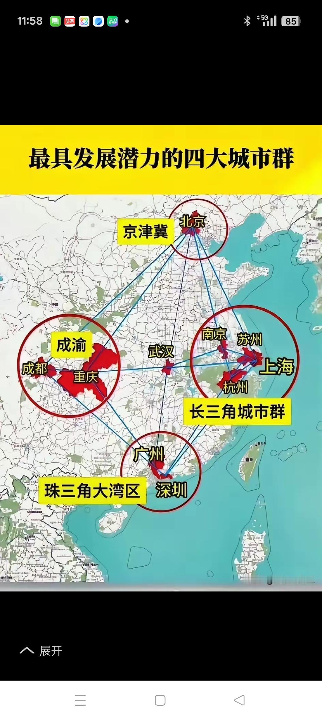 打造中国更大区域的经济区 中国东南西北四个方向各有一个城市群,它们分别是长三角、珠三角、成渝、京津冀城市群。是否可以以上述四个城市群为基础,并将由四个城市群围成的区域的省份组成一个更大区域的经济区。发挥各自城市群的优势,带动区域内其他城市的协调发展,形成全球最大的经济区,推动整个区域经济的快速提升。