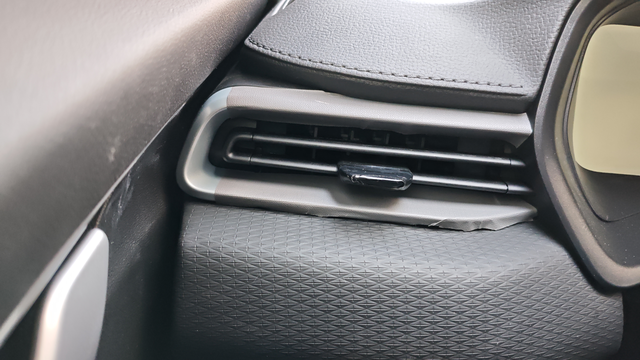 帝豪四代后视镜反光之空调出风口diy 帝豪第四代空调出风口是银色的,出风口把手也是白色的,在车窗贴膜以后,会在后视镜镜面位置反光,斜着两道,影响观看后视镜。正好手头零零星星有些东西,经简单比划,用深色木纹纸贴了一下边框局部。出风口把手是白色的,解决方法,用黑色胶带贴了一下,又用热缩管包住,电吹风加热后收紧。整体效果良好。。。。从最后一图右侧后视镜图中,可以看到未贴木纹纸的边框在玻璃上仍有部分反光,但由于超出后视镜镜面了,实际观看不影响使用。 不经常干这个,图中看出来手工活有点粗糙,供大家参考,自己弄不了,可以找贴膜的或者其他人帮忙处理一下。