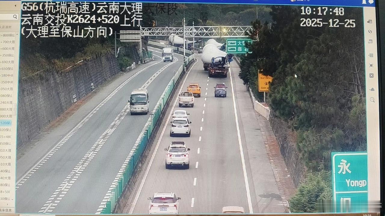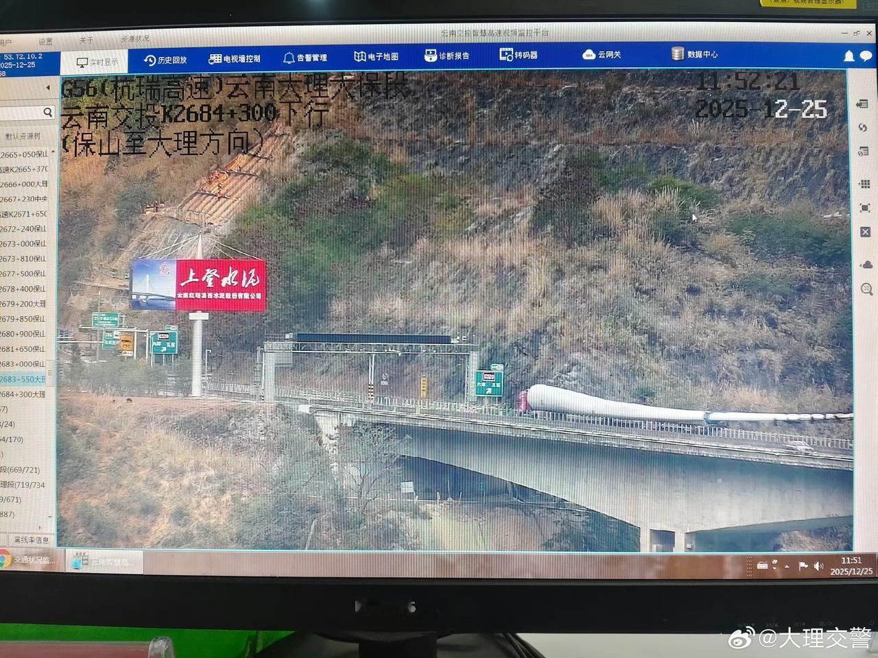 2026年1月13日,三辆运输风力发电机叶扇的大件运输车从G5621昆楚大高速出发,从江风寺立交(杭瑞高速K2562附近、小地名塘子埔)汇入G56杭瑞高速,途经杭瑞高速K2562——K2685(澜沧江大桥),继续驶往保山市辖区高速公路。 大理交管支队高速公路三大队辖区通行时间预计:8时10分——12时30分许。 由于每辆大件运输车运载的叶扇和车头总长近100米。届时,杭瑞高速大理往保山方向道路通行缓慢,大件运输车将在途中选择直线距离足够长的路段,停车让行。 1月13日上午,计划沿杭瑞高速,从大理往保山方向通行的车辆,建议错时出行或绕行其它道路。 下图为以往大件车通行照片。大理路况 大理高速公路