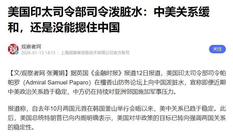 美军方高层出来对我们放话了! 1月12日,美国印太司令部司令帕帕罗通过媒体表态称,尽管美中关系在政治层面趋于稳定,中国仍持续在亚太地区展现强硬军事姿态,对多个国家形成压力,特别是在东南亚与南海周边。 自去年10月中美两国元首在韩国釜山会晤后,双边关系就进入了相对稳定的互动期,美方也多次表态要将“战略稳定”作为对华关系的主轴。 可就在这种积极氛围下,帕帕罗却公然颠倒黑白,宣称中国解放军没有因为中美政治互动回温而放缓行动,反而在周边海空域不断测试区域国家的底线,还暗指中方针对菲律宾的相关回应是“施压”行为。这番言论纯属无稽之谈,简直是混淆是非、颠倒黑白。 中国在南海、台海等周边海空域的所有行动,都是在捍卫国家主权和领土完整的正当权利范围之内。黄岩岛是中国的固有领土,中方对其附近海域的管辖是合法合理的,所谓“针对菲律宾的不当行为”,本质上是对相关国家侵权行为的必要回应,完全符合国际法和国际惯例。 而中国人民解放军在台岛周边开展的演练,更是针对“台独”分裂势力和外部干涉势力的震慑行动,目的是维护台海地区的和平稳定,这一点有目共睹,绝非帕帕罗口中的“测试底线”。 更值得玩味的是,帕帕罗的这番发难,全程没有任何实质性的强硬警告,翻来覆去强调的只是“同盟凝聚力与伙伴关系的重要性”,这就很能说明问题了。 美军嘴上喊着“中国施压”,却不敢拿出任何针对性的强硬举措,只能靠拉拢盟友来壮声势,这种姿态分明就是典型的“硬中带软”。说白了,美军方现在就是想靠几句狠话撑撑场面,实际上根本不愿意跟中国搞针锋相对的对抗,这背后藏着的正是自我克制的心态。 这些年中国军力的发展有目共睹,帕帕罗自己之前在国会听证会上都承认,中国战斗机的生产率已经超过美国,在人工智能等尖端技术领域也处于领先地位,在第一岛链范围内,中国已经具备阻止美国取得空中优势的实力。 这样的实力对比之下,美军心里很清楚,真要跟中国硬刚,自己讨不到任何好处。所谓的“中国施压”,不过是为了给自身扩充军力、拉拢盟友找借口罢了。 当前的中美关系大背景,美方一边想在经贸、气候等领域跟中国合作,一边又在军事领域刻意制造对立,这种“说一套做一套”的操作本身就充满矛盾。 帕帕罗这次的表态,其实就是这种矛盾心态的集中体现。既想靠渲染“中国威胁”来争取国内军费预算、安抚盟友情绪,又怕真的激化矛盾破坏中美关系的稳定势头,最后只能拿出这种“嘴硬心软”的招数。 中国一直坚持走和平发展道路,在周边海空域的行动始终保持克制,目的就是维护地区的和平与安宁。美方如果真的想推动中美关系“战略稳定”,就应该摒弃这种颠倒黑白的言论,停止炒作“中国威胁论”,用实际行动落实双方达成的共识。