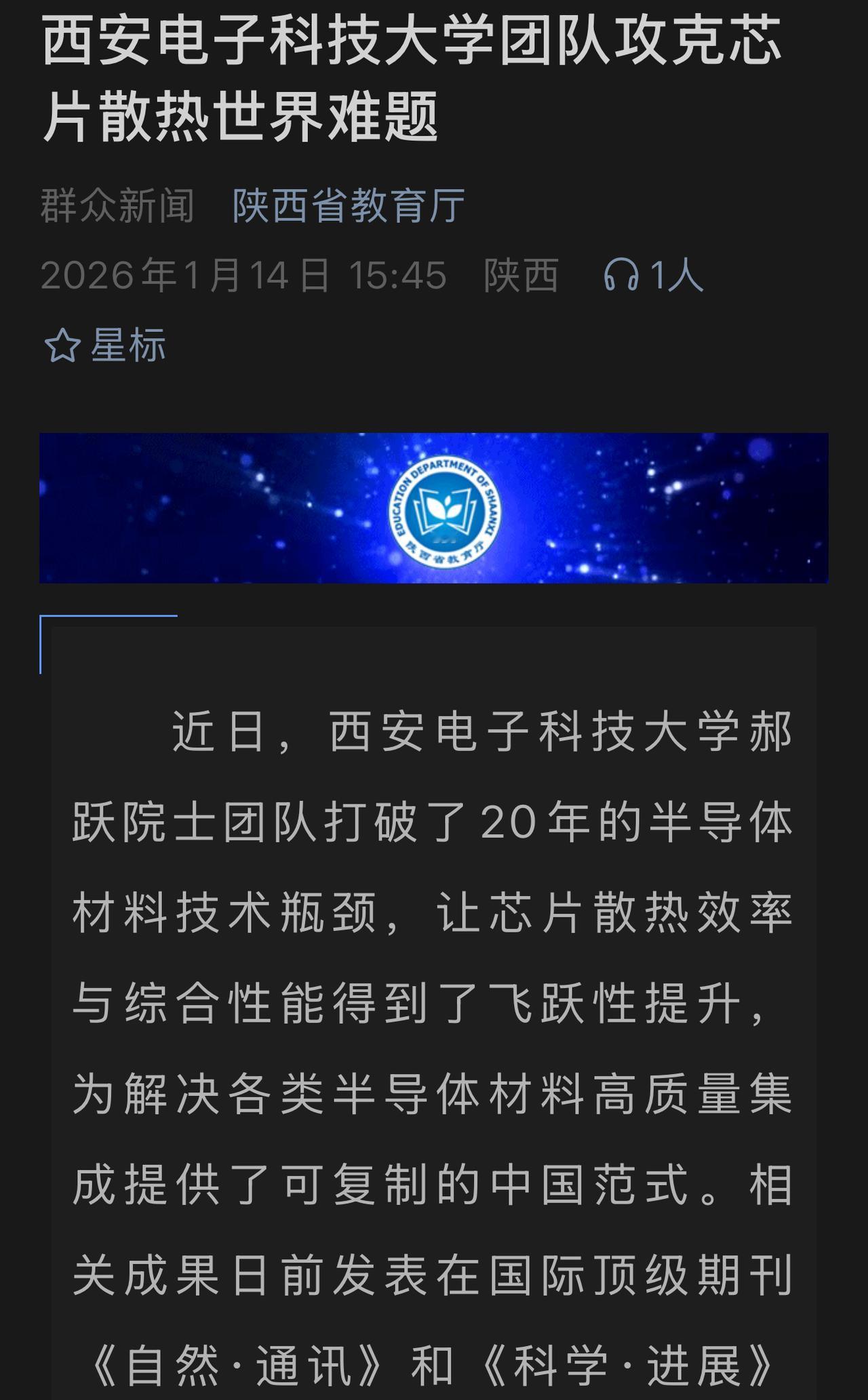 西电传来喜讯,该校刚刚攻克一项世界技术难题! 西安电子科技大学这次为国争光了! 据多家媒体报道,西安电子科技大学已经攻克芯片散热这一世界难题,这一成就令世界瞩目! 这一技术成果是郝跃院士带领团队攻克的,这一研究成果突破了20年半导体材料技术的瓶颈,目前相关成果发表在国际顶尖期刊上,得到世界关注! 西安电子科技大学这一次为国家争光了,也是陕西的骄傲! 西安身边事