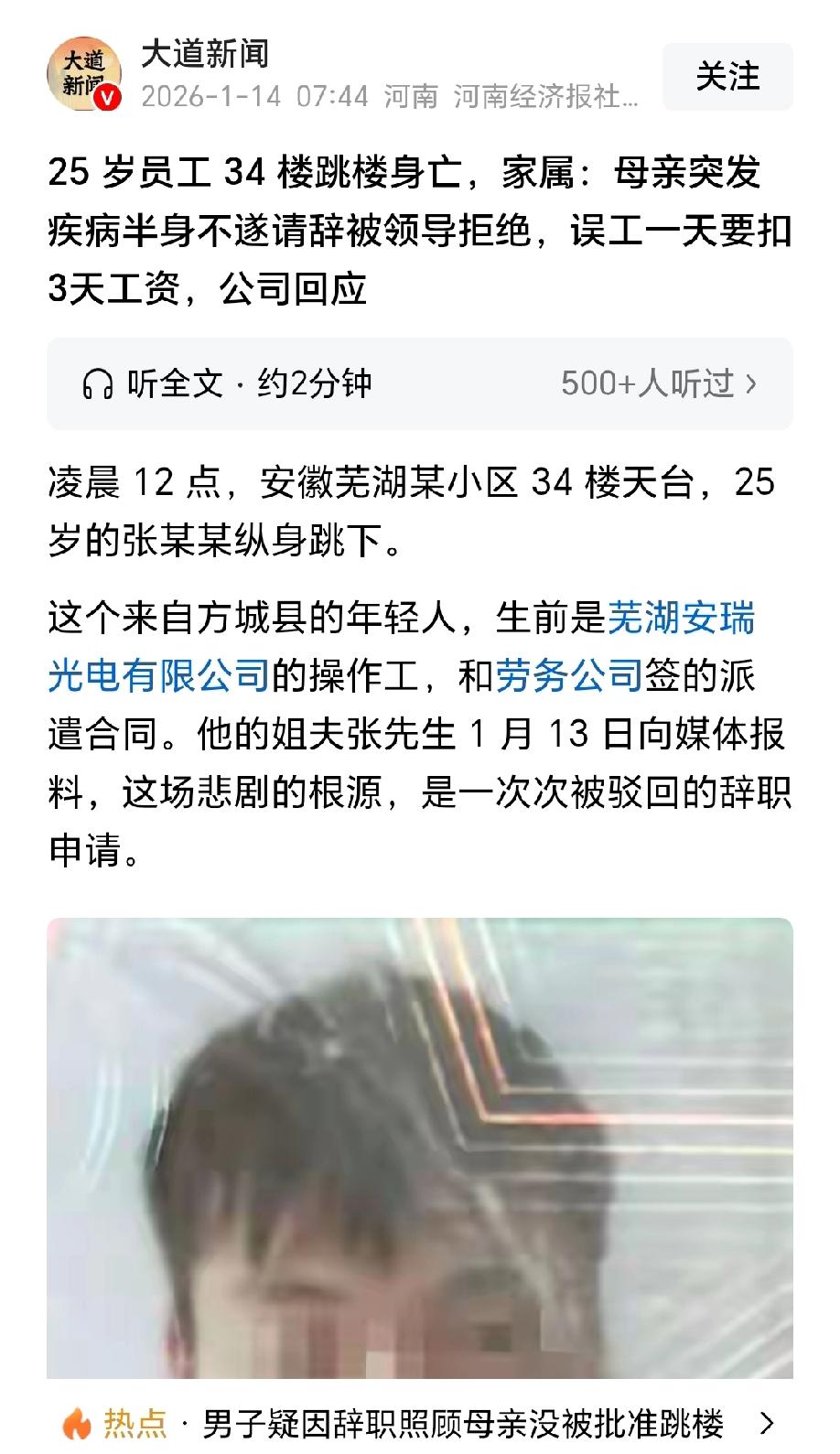 打工人的难处!安徽芜湖,母亲突然患病半身不遂,急需有人照顾,25岁的男子因此提出辞职,想回家尽孝,不料却遭到公司领导的拒绝。男子反复向公司提出辞职,却被告知误工一天要扣三天的工资。男子辞职辞不了,走又不敢走,左右为难之下,选择从34楼纵身跳下。事后,男子家属找公司讨要说法,公司矢口否认不准辞职的情况。 据大道新闻报道,2025年12月27日深夜,25岁的张某某站在某小区34楼的天台,带着心里积攒的委屈和绝望,最终选择纵身跳下。 他实在是为难,一边是母亲躺在床上半身不遂,急需人照顾的难处,一边公司领导一次次拒绝他辞职的冰冷面孔,他实在无法抉择。 张某某原本是某光电有限公司的一名操作工,和劳务公司签的派遣合同。 他平日里话不多,干活踏实,一门心思就想着多挣点钱,让老家的日子过得好一点。 可谁能想到,变故来得如此突然。 2025年10月,家里传来噩耗,母亲突发疾病导致半身不遂,生活完全不能自理,急等着有人回家照顾。 接到消息的那一刻,张某某的心揪成了一团,他第一时间就向公司提出辞职。 工作没了可以再找,可母亲只有一个,眼下正是最需要他的时候,张某某要回家给母亲尽孝。 可领导听完他的诉求,直接摇了摇头,以人员紧张、岗位缺人为由,驳回了他的辞职申请。 张某某不死心,一次又一次地找领导沟通,语气从恳切到哀求,把家里的难处说了一遍又一遍。 可每次得到的答复都差不多,要么是让他再等等,要么就是甩出一句冷冰冰的规定:要是敢擅自离岗,误工一天扣三天工资。 这话像一把枷锁,牢牢地困住了张某某。 他何尝不想直接收拾行李回老家?可他知道,自己要是走了,之前辛苦攒下的工资很可能会被扣得所剩无几,到时候拿什么给母亲治病、请护工? 一边是卧病在床、急需照料的母亲,一边是不让辞职、还要扣钱的公司,张某某被夹在中间,每天都活得喘不过气。 他常常在下班后一个人坐在宿舍发呆,眼神里满是疲惫和无助,工友们偶尔问起,他也只是强颜欢笑。 日子一天天熬着,张某某的精神状态越来越差,脸上的笑容越来越少。 直到12月27日下班后,压垮他的最后一根稻草终于落下,深夜的天台,成了他最终的选择。 当张某某的家属赶到芜湖,看到的却是冰冷的遗体,一家人哭得撕心裂肺。 他们怎么也想不通,一个好好的小伙子,怎么就走到了这一步?这一切的根源只能归咎于公司的不通情理。 悲痛之余,家属找到涉事公司讨要说法,他们坚信,弟弟的死和公司不准辞职、威胁扣工资脱不了干系。 家属想找用工单位,可他们来了十多天,连公司的大门都进不去。 更让人心寒的是,劳务公司的工作人员却矢口否认,说根本不存在辞职不批准的事,还表示已经和家属协商过,但双方没能达成一致。 好在,张某某生前的多名工友都愿意站出来作证,证明他确实多次提出辞职,却一直没能获批。 记者随后联系公司询问情况,工作人员表示暂时不了解情况,会把该情况转达给领导。 辖区派出所也透露,目前已经排除他杀可能,家属对死因没有异议,只是案件还没完全解决,其他细节不便透露。 其实,张某某不用这么走极端,完全可以通过法律武器来维护自己的合法权益。 《劳动合同法》第三十七条规定:劳动者提前三十日以书面形式通知用人单位,可以解除劳动合同。劳动者在试用期内提前三日通知用人单位,可以解除劳动合同。 本案中,张某某作为派遣制员工,与劳务公司建立劳动合同关系,其辞职权利受法律保护。 公司以“人员紧张、岗位缺人”为由拒绝批准辞职,无任何法律依据,属于违法限制劳动者辞职权的行为。 张某某只要以书面形式提前30日通知,到期后劳动关系即依法解除,用人单位必须办理离职手续并足额结算工资。 若用人单位拒不配合,张某某可向劳动监察部门投诉或申请劳动仲裁维权。 《工资支付暂行规定》第十六条规定:因劳动者本人原因给用人单位造成经济损失的,用人单位可按照劳动合同的约定要求其赔偿经济损失。 经济损失的赔偿,可从劳动者本人的工资中扣除。但每月扣除的部分不得超过劳动者当月工资的20%。若扣除后的剩余工资部分低于当地月最低工资标准,则按最低工资标准支付。 张某某不知道,公司无权任意扣罚工资,仅能在他造成直接经济损失时,按法定比例从工资中扣除赔偿款。 至于公司以“误工一天扣三天工资”为威胁,完全违反法律规定。 一方面,张某某的辞职诉求本身合法,不存在“给用人单位造成经济损失”的情形。 另一方面,即使存在误工,“扣三倍工资”也远超法定的“每月扣除不超当月工资20%”的上限,且无任何法律依据支持此类惩罚性扣款。 公司的该规定属于无效规章制度,张某某有权拒绝履行,并可要求用人单位返还已扣罚的工资。 只可惜,张某某不懂法,让一条年轻的生命,就这样在“尽孝”和“工作”的两难抉择中戛然而止。