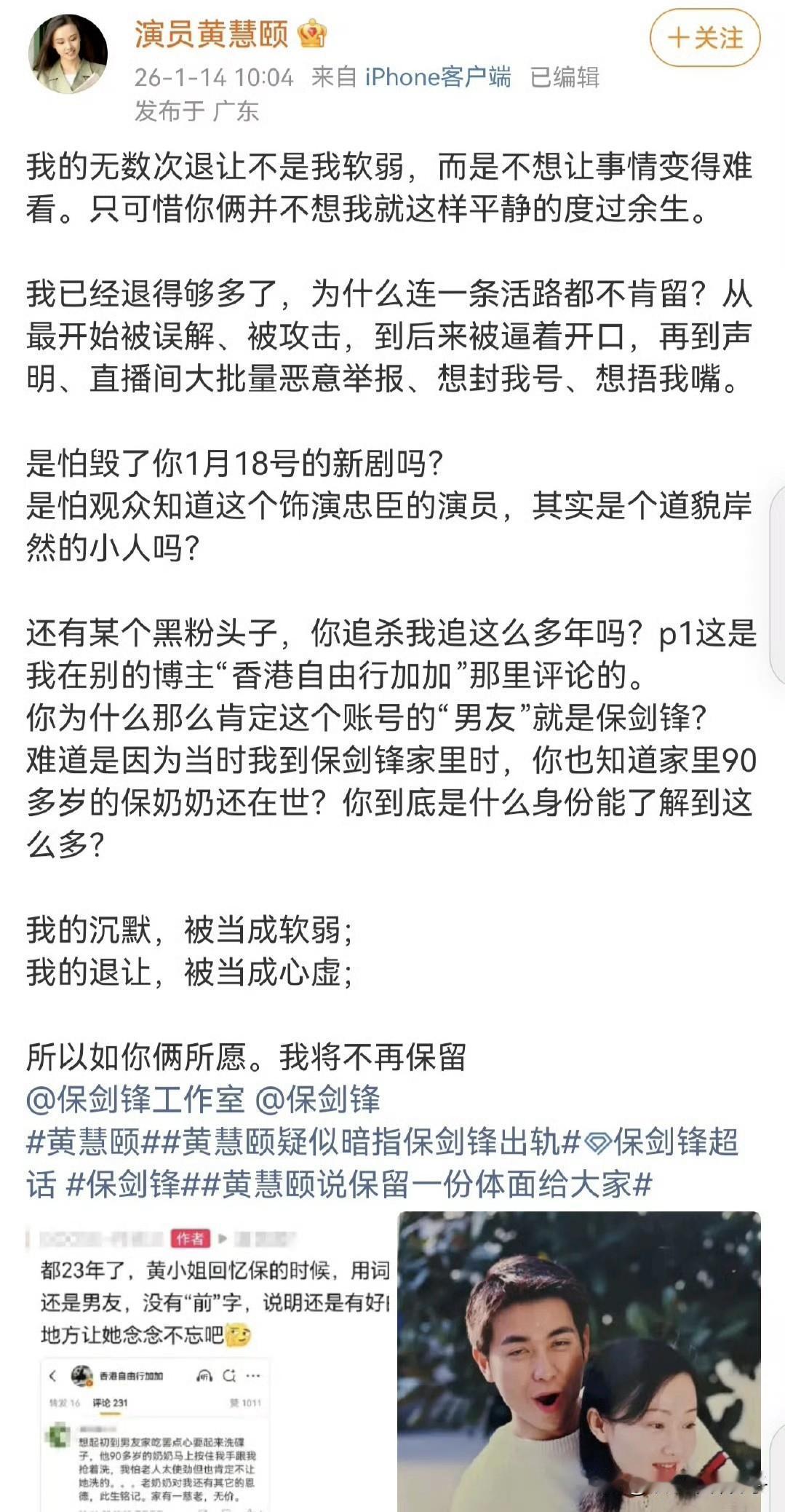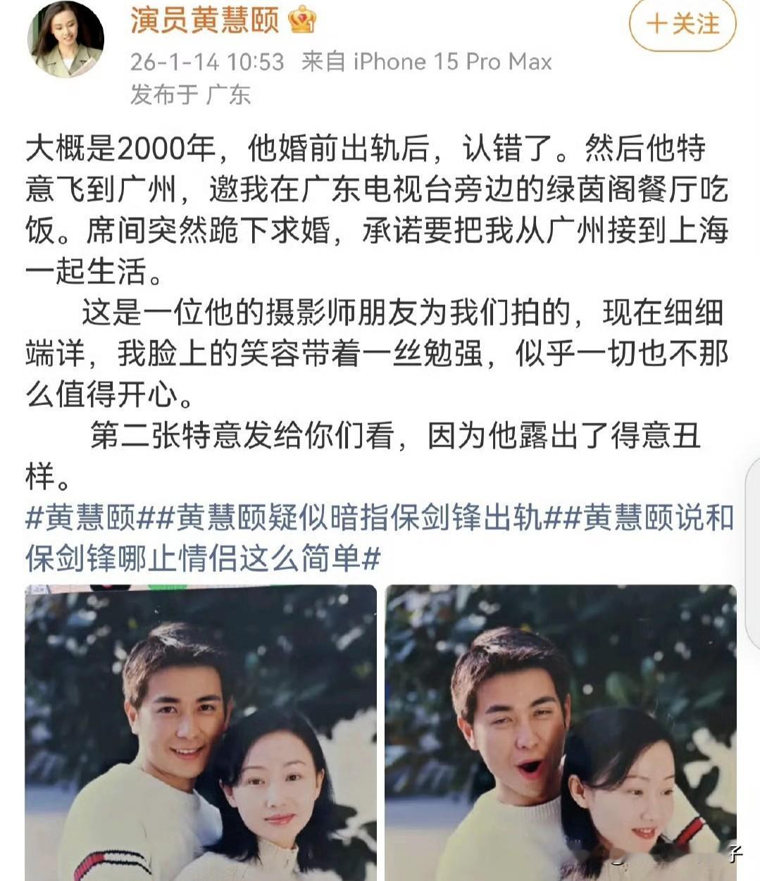 女演员黄慧颐发文爆料,并晒出亲密合照,真替保剑锋捏把汗! 1月14日,女演员黄慧颐连续发文爆料,而且这一次,已经不是简单的暗示,直接晒出与保剑锋的亲密合照,并艾特对方。 除了文案中,还在评论区爆料,说实话,看完以后,真的替保剑锋捏把汗。 特意到网上查了一下,保剑锋与何珈好在2009年结婚,黄慧颐提到的时间是2000年。 试想一下,如果真如黄慧颐所说,整整隔了九年,保剑锋才结婚,这似乎有点不太合乎常理。 黄慧颐给人的感觉温柔又善良,不像会撒谎的样子。 保剑锋不仅帅气,演技也好,一家三口非常幸福,堪称娱乐圈的模范夫妻。 咱就说,这中间会不会有什么误会?作为恋人,至少曾经深爱过,过了这么久,有些事应该学会放下了。 当然,未尝他人苦,莫劝人大度,黄慧颐的经历,不得而知,感觉保剑锋又是专一负责任的好男人。 如果真有误会,解开就好了,这样以后彼此不必互相打扰,各自生活。 就事论事,没有实锤的爆料,未必可信,作为路人,只能安静的吃瓜,等待当事人的回应。