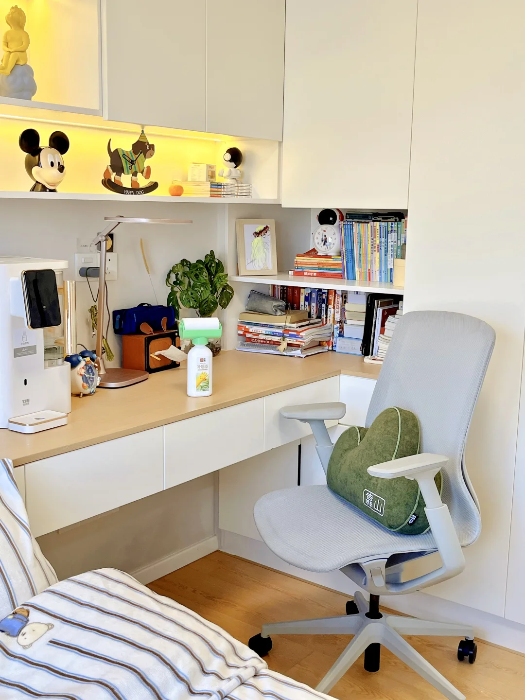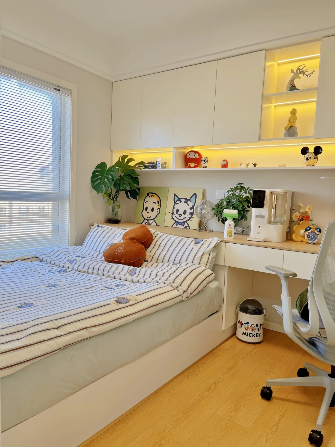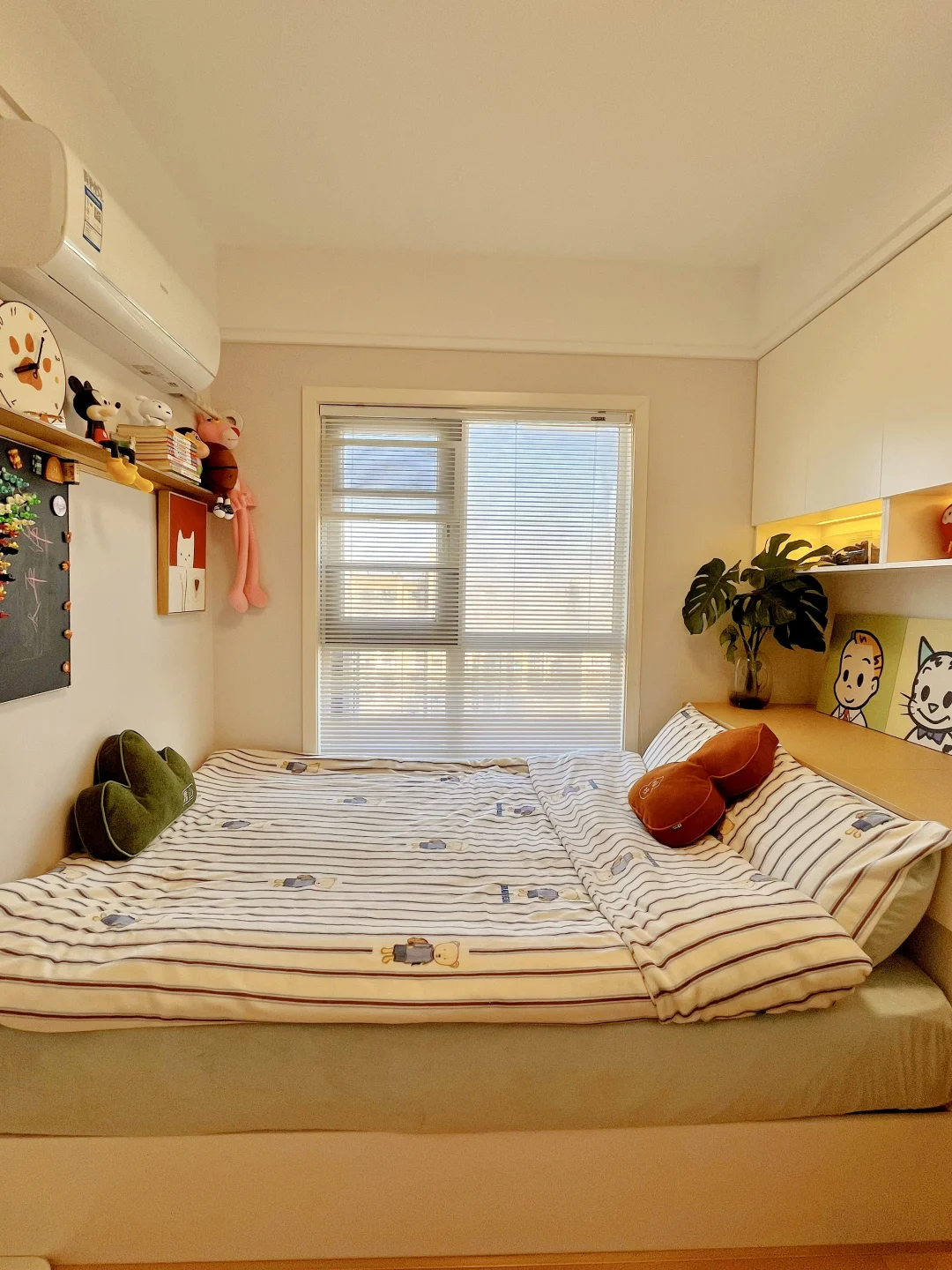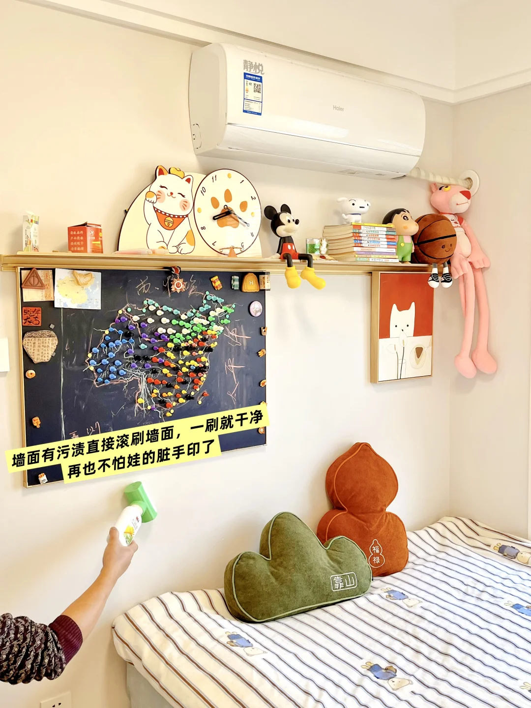 很多朋友问我家儿童房怎么能一直保持干净清爽?其实就两点:一是收纳要足够,二是墙面常维护。我家是木工打的榻榻米+衣柜+书柜一体,东西都能收进柜里,桌面不乱堆,自然就整洁了