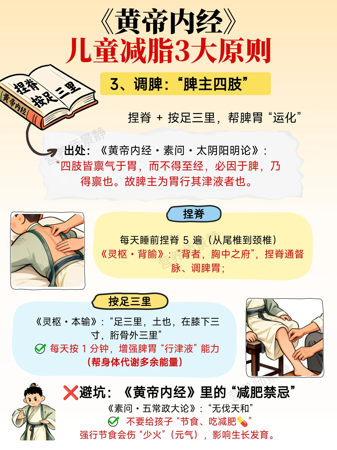 《黄帝内经》告诉我们 孩子胖,很多时候不是吃太多,而是身体“消化和代谢跟不上”。 . 说白了,就是脾胃没养好。 吃进去的营养没被好好利用,没去长个子、补气血,反而堆成了肉。 . 今天把我自己实践下来、相对温和也好坚持的方法分享给大家: 不节食、不猛练,先把脾胃养顺,体重自然慢慢往下走。 . 1️⃣第一件事:吃饭不是少吃,而是“吃对” 《黄帝内经》里讲过一句话:“五谷为养。” 意思不是让孩子不吃主食或者只吃主食,而是主食吃对了,脾胃才能正常工作。 . 可以这样搭配 小米:可以和大米一起煮饭,最养脾胃,孩子不容易积食 燕麦:可以加蔬菜、鸡蛋一起做成蔬菜燕麦饼,肠道蠕动会好很多 山药:蒸着、煮着都行,健脾又顶饱 糙米:替代一部分白米,膳食纤维更多,饱腹感强 . 这样吃下来,孩子不容易饿,自然也就少吃零食了。 . 同时一定要注意少吃甜腻、油炸的东西。 《黄帝内经》里有句话:“甘者令人中满。” 甜食吃多了,脾胃容易“罢工”,积食一多,体重自然往上涨。 . 平时多给孩子吃点绿叶菜,比如菠菜、西兰花、油麦菜。 老话讲“五菜为充”,蔬菜是帮脾胃“分担工作”的,比各种补剂实在多了。 . 2️⃣第二件事:睡好觉 + 轻运动 很多家长一看孩子胖,就想着“多运动”。 但《黄帝内经》强调的是:“夜卧早起,广步于庭。” 翻译成大白话就是: 睡好觉 慢慢动 我家现在尽量做到: 晚上 10 点前上床 7–12 岁孩子 9–11 小时睡眠 睡眠一稳,孩子白天精神状态、食欲节律都会好很多。 . 运动方面,我从不逼他跑圈、刷跳绳数量。 放学后就在小区里慢走20分钟, 或者骑骑车、追追跑跑,让他舒舒服服地动一动。 . 老祖宗也提醒过:“久行伤筋。” 孩子还在长身体,强度太大的运动反而容易适得其反。 . 3️⃣第三件事:一个很多人忽略的小细节 每天睡前,我会给孩子做两件小事: 捏脊 5 遍:从尾骨慢慢捏到颈部 按足三里 1 分钟 . 《黄帝内经》里说:“脾主四肢。” 脾胃运转顺了,身体代谢自然会跟上。 坚持一段时间你会发现: 孩子胃口更稳定 人有精神了 体重开始慢慢往下走 . 养娃这件事,真的不用太“狠”。 孩子的首要任务永远是好好长身体。 顺着身体规律,把脾胃、作息、状态养好。 . 如果你家也有小胖娃, 不妨试试这种更温和、也更好坚持的方式。 有其他养娃问题,欢迎评论区一起聊 ❤️