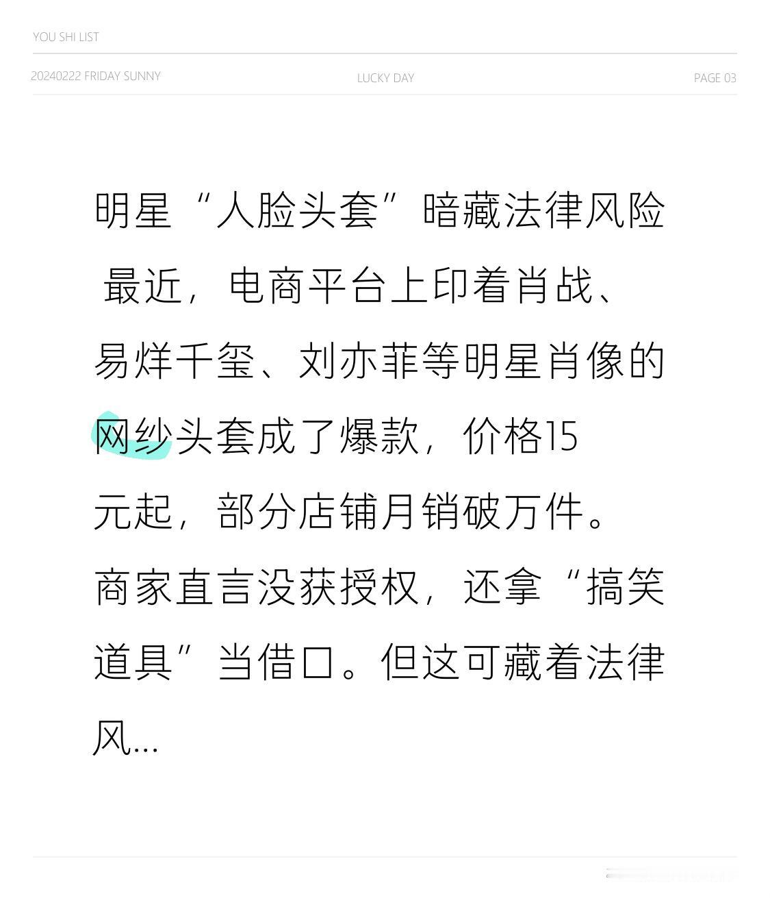 明星“人脸头套”暗藏法律风险 最近,电商平台上印着肖战、易烊千玺、刘亦菲等明星肖像的网纱头套成了爆款,价格15元起,部分店铺月销破万件。商家直言没获授权,还拿“搞笑道具”当借口。 但这可藏着法律风险呢。《民法典》规定,未经肖像权人同意,不得制作、使用、公开其肖像。商家未经授权制作销售明星头套,妥妥侵犯了肖像权。“搞笑”可不是侵权挡箭牌,只有在法定免责情形下使用才不算侵权,这商家的理由根本站不住脚。这哪是娱乐道具,分明是法律“雷区”,可得小心!