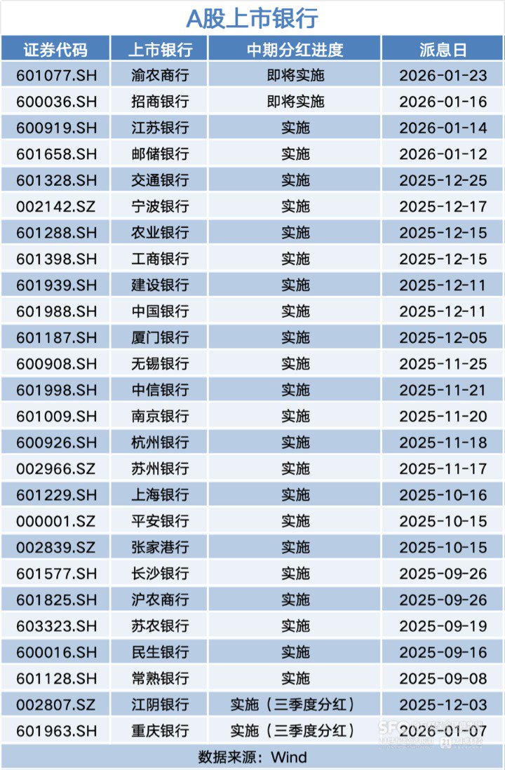 2026年开年,已有三家银行已派发2025年中期/三季度分红:重庆银行已于1月7日发放三季度现金红利约5.85亿元;邮储银行于1月12日发放中期分红共147.72亿元;江苏银行于1月14日派发现金红利约60.72亿元。