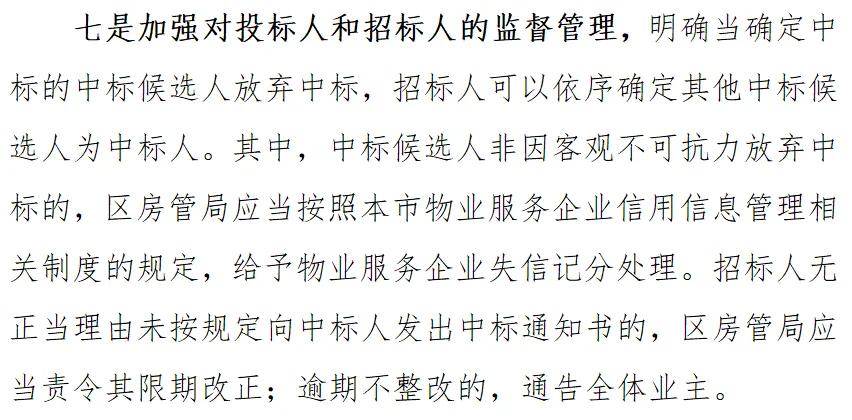 针对中标物业,如并非因不可抗力放弃中标,物业将被扣除信用分,开发商或业委会无正当理由未按程序发中标通知,房管局将责令整改并通告全体业主。
