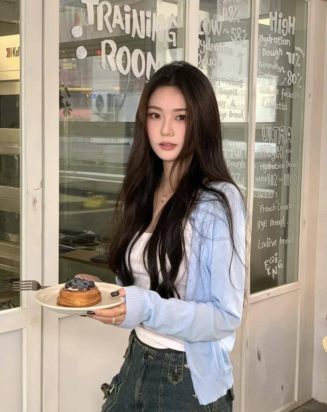 淡蓝色的针织开衫裹住温柔,在街角咖啡店和甜品撞个满怀,把平凡日子过成甜甜的模样