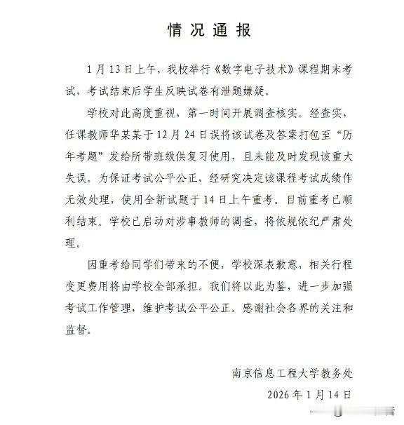 南京信息工程大学泄题事件恐怕不是个例。 1月14日,南京信息工程大学教务处一则通告将此次泄题事件归咎为任课教师误将本学期考试试卷归类到历年考试试卷中发放给学生复习使用。 学校采取的措施是,该学科考试无效,已放假学生被召回学校重新考试,产生的行程变更费用由学校全部承担。 看似不大的一件事情参杂了舆情,但同时也暴露了学校在教学考试环节的把关松懈,相关专业、系部教学负责人责无旁贷。 这则通报让人看了感觉和没看差不多,主要是从学校的通报中没有看到大家希望看到的内容。南京信息工程大学 (图片引用自网络)