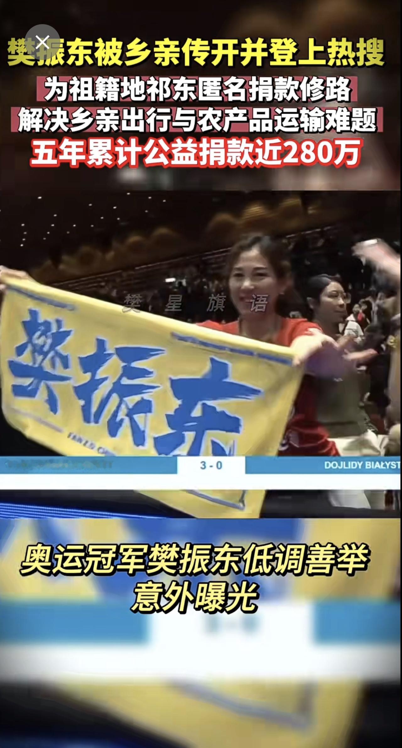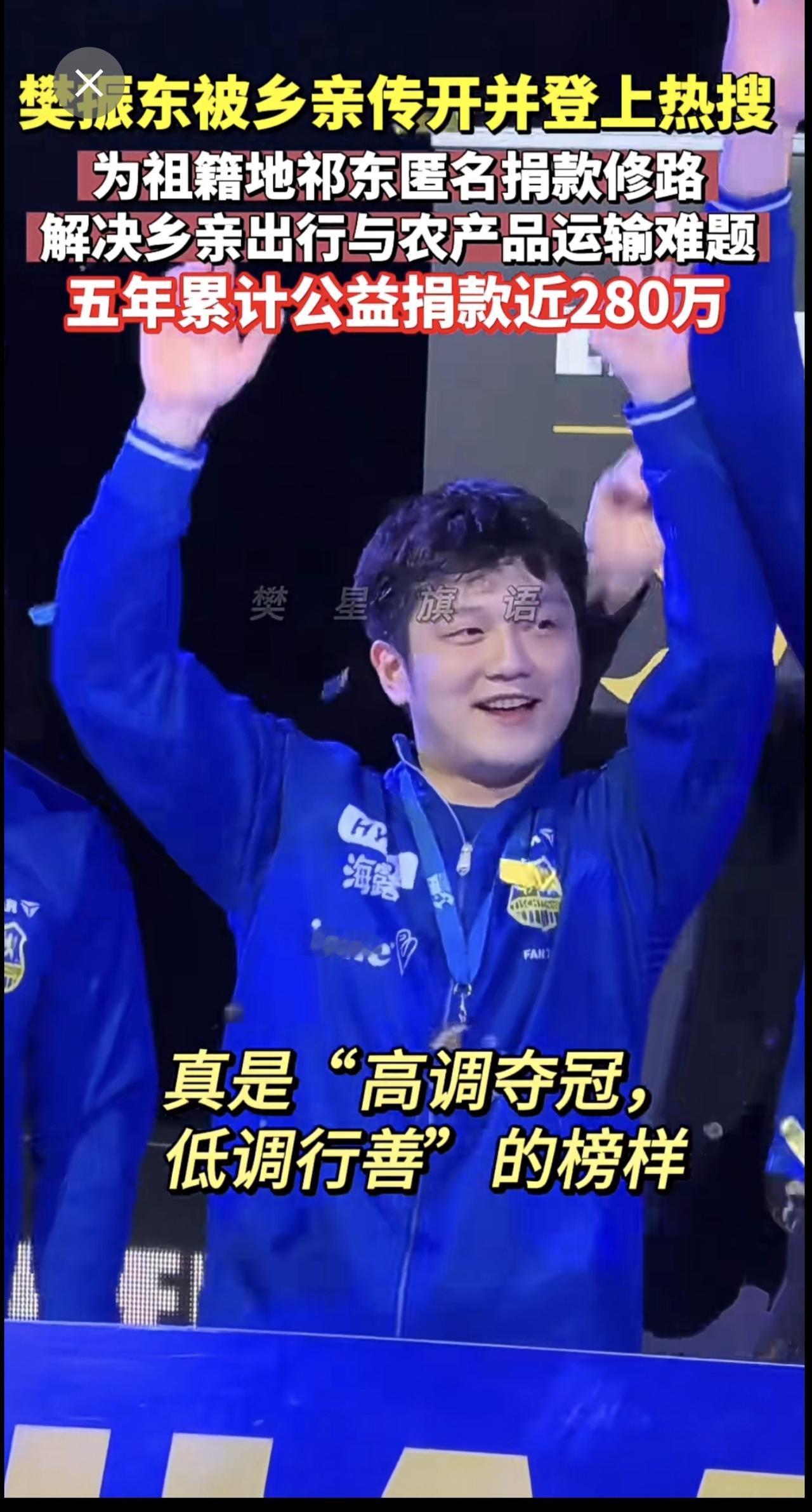 广州樊先生五年捐款280万 樊振东又一次登上热搜,五年来低调行善,为祖籍地祁东匿名捐款修路,为灾区捐款,一直都以“广州樊先生”名义捐款,默默付出,这真是“高调夺冠,低调行善”的榜样!值得我们学习和弘扬!为你点赞👍🏻👍🏻👍🏻樊振东 乒乓球 世界冠军