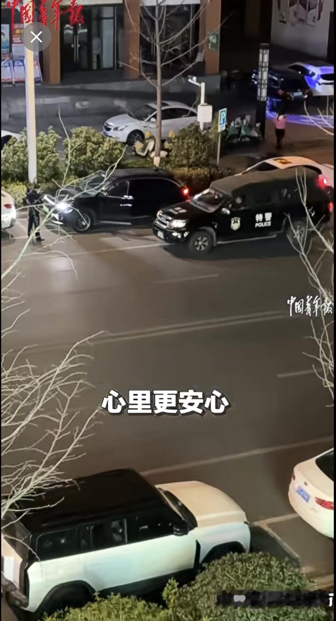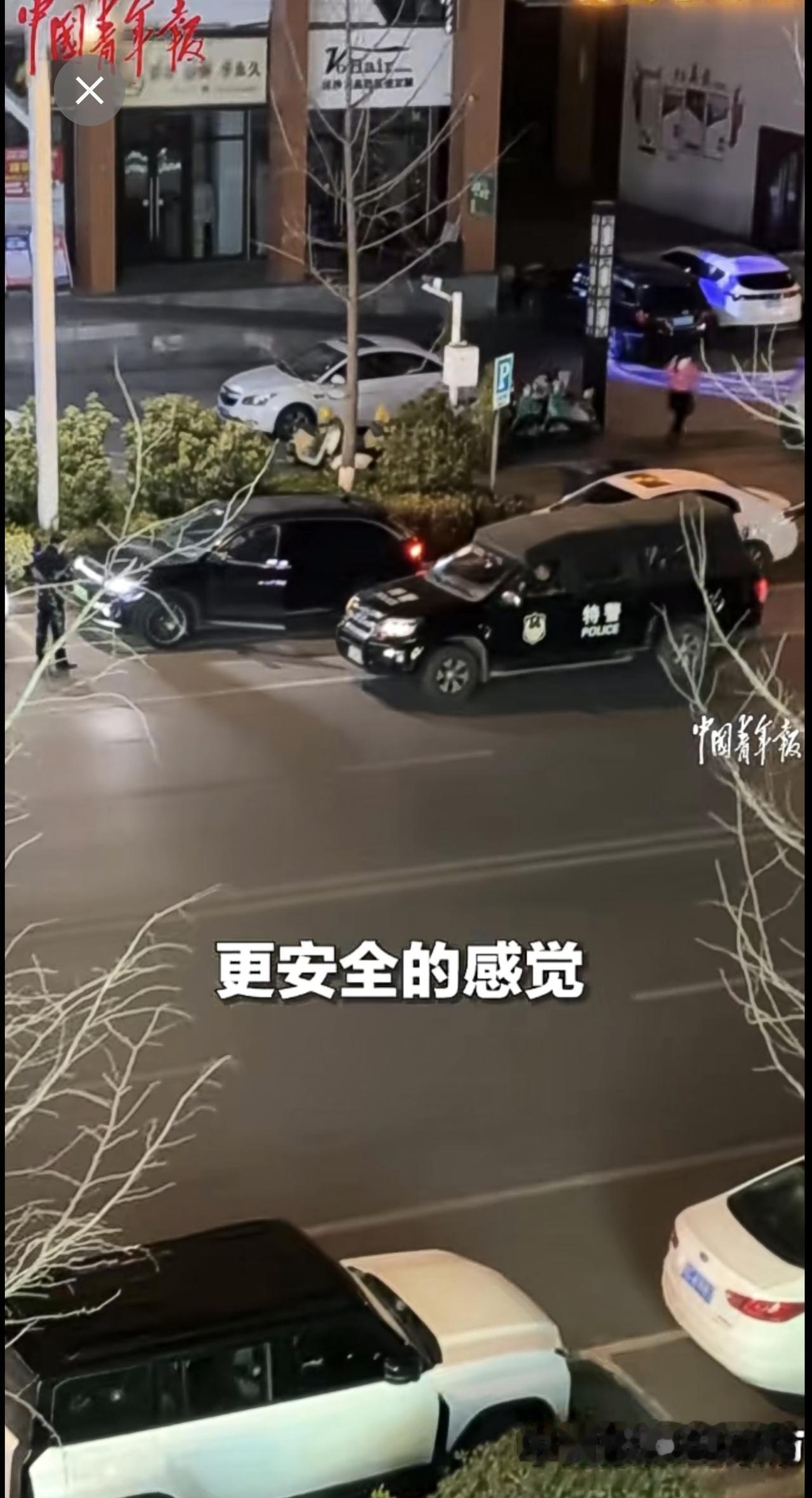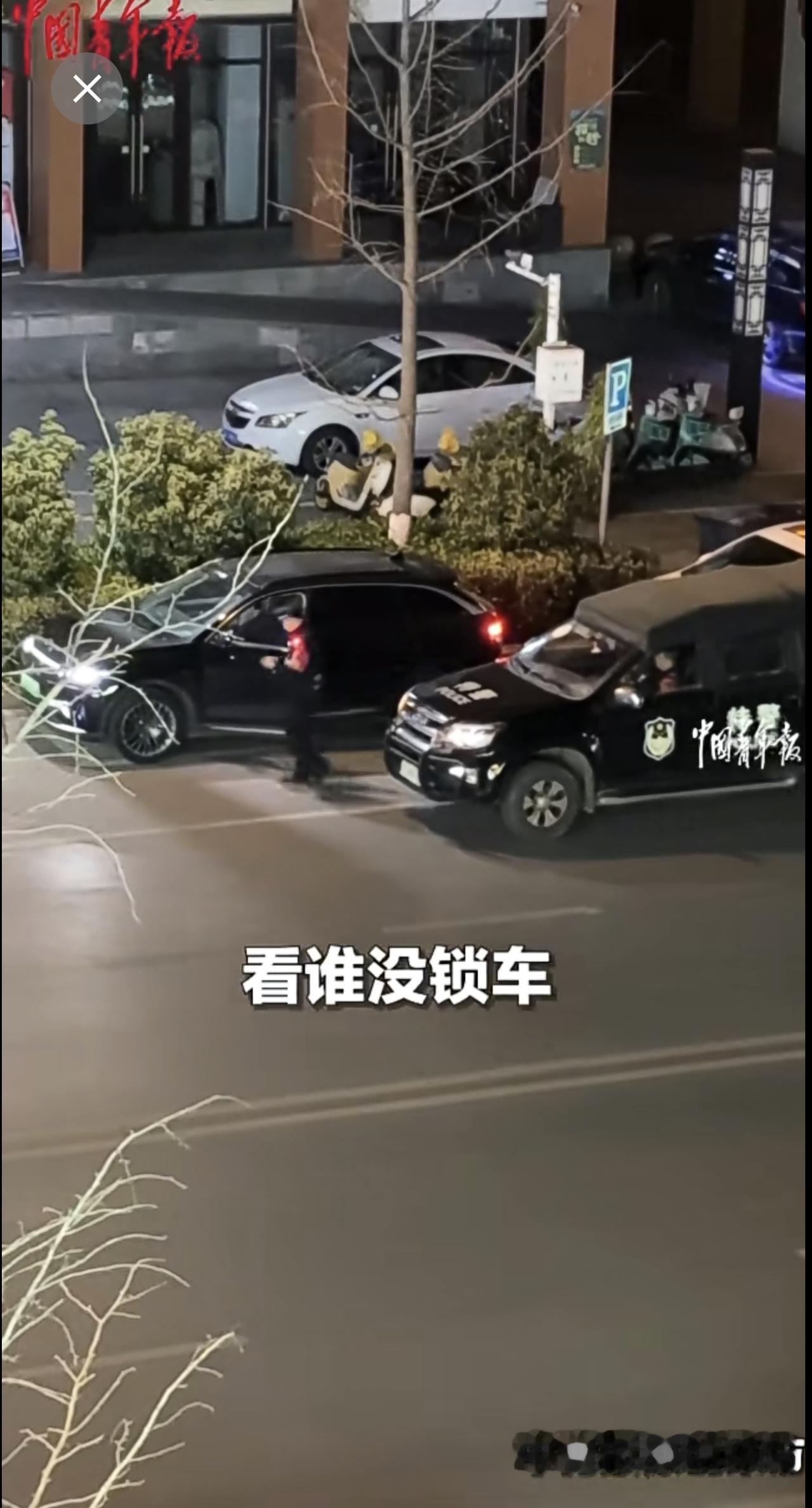 近日,江西万载,女子看见楼下特警巡逻,挨个拉停靠在路边车辆的车门,排查车辆落锁情况,安全感爆棚!(来源:中国青年报)江西