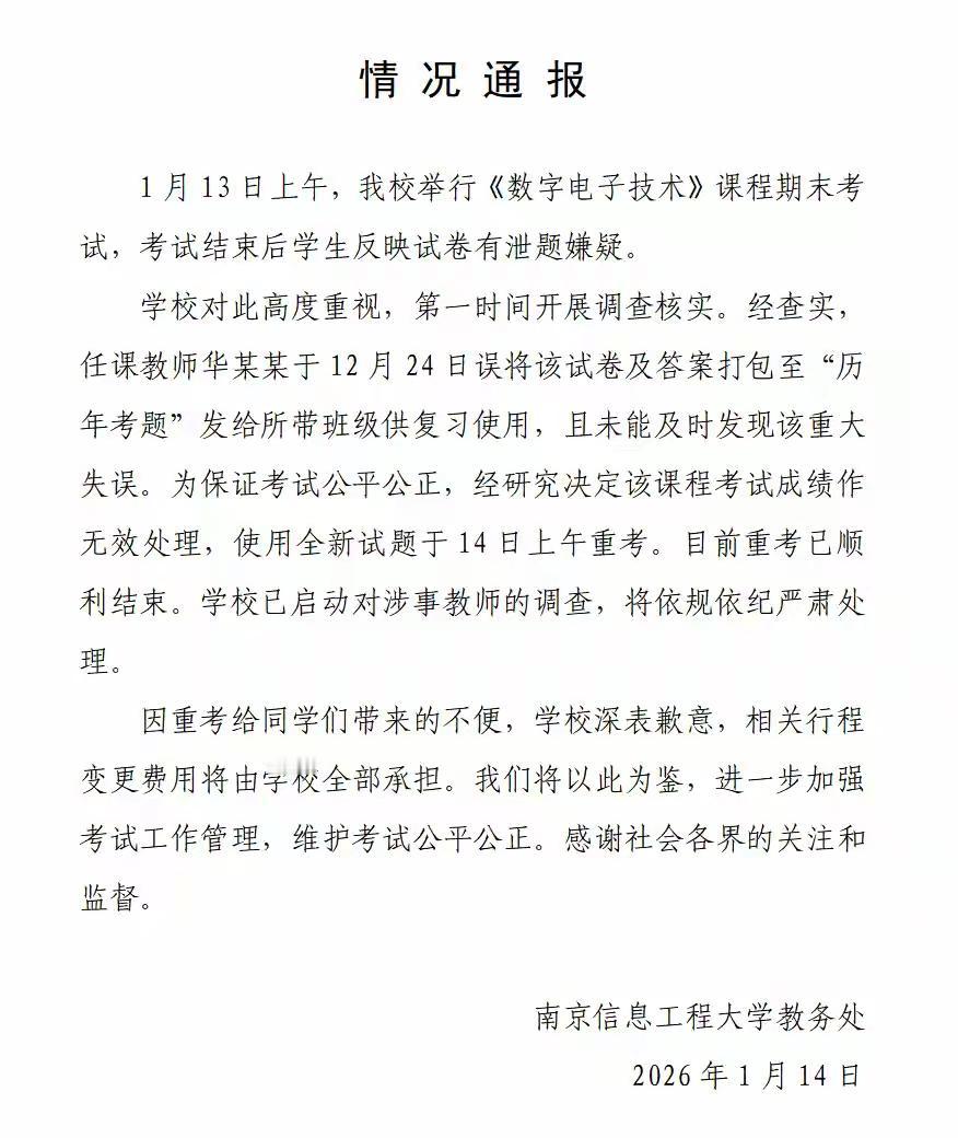 如果,大学期末考试,从全国题库里出题,随机组织试卷,不让任课老师自己出,那高校的教学成绩会上几个档次? 高校教师将期末考试题打包发给学生,供学生复习用,这听起来有点天方夜谭,但还真是越是不可能犯的错越有可能犯。 上过大学的应该都知道,期末考试前,老师会划重点,这个重点能救命,能让一学期不怎么学的也及格。就像这位老师,本意是给学生发历年真题,让学生复习。结果,把自己出的当年真题也给发过去了。 那为了避免此类问题再次发生,可不可以使用同一版教材的老师每人出一套题上传到题库,学生考试时从题库里随机生成一套题目,这样就可以避免此类问题。 另外,这样,学生学习积极性也提高了,教学成绩也提高了,一举多得。