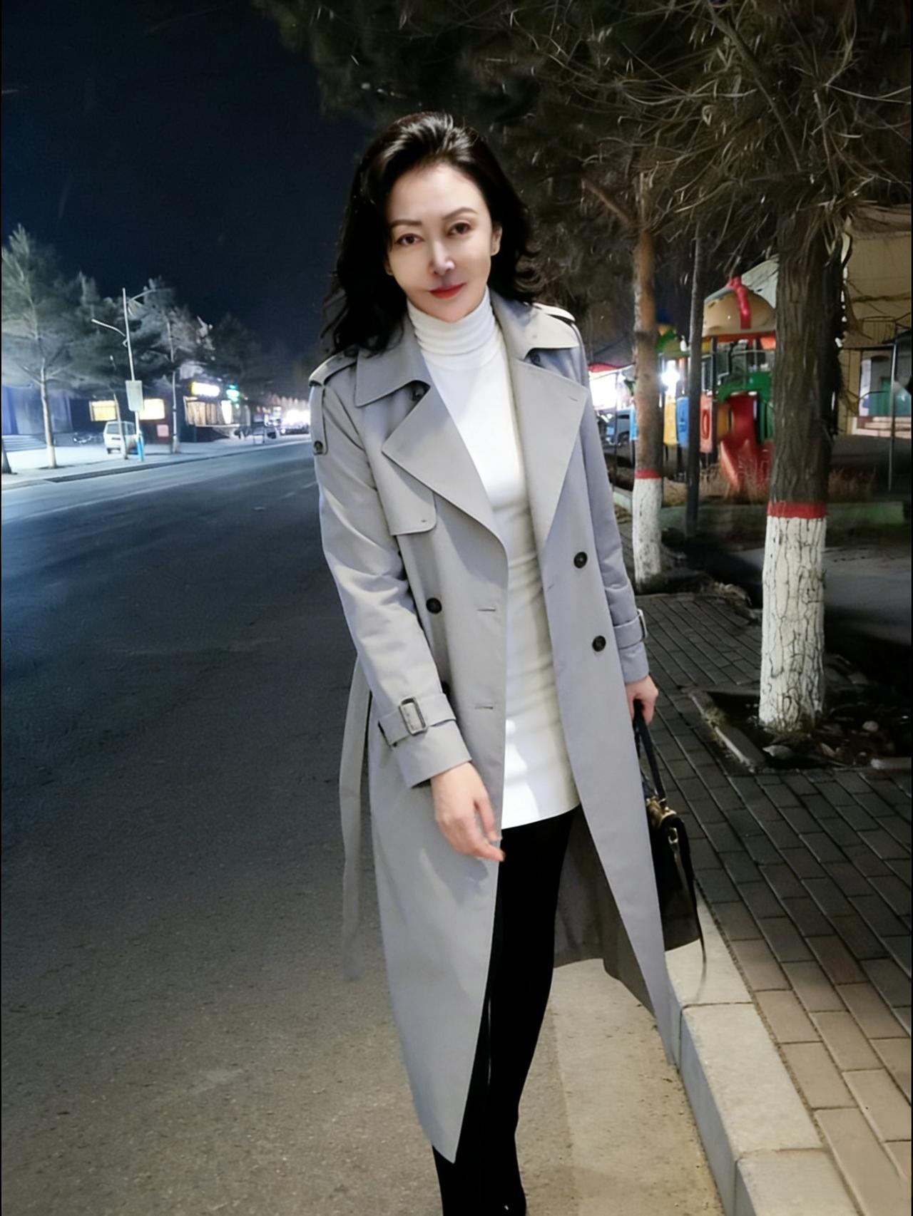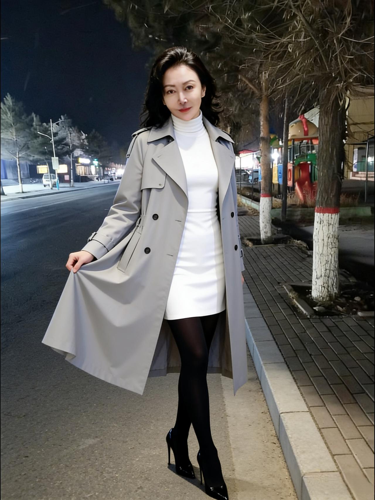 街灯摇影夜生寒,风衣轻裹玉容颜。 白裙漫卷三分月,黑靴深踏一寸欢。 持暖盏,倚阑干,红唇微启笑嫣然。 冬宵因她添春色,不羡梅花傲雪妍。