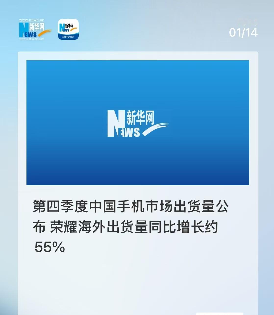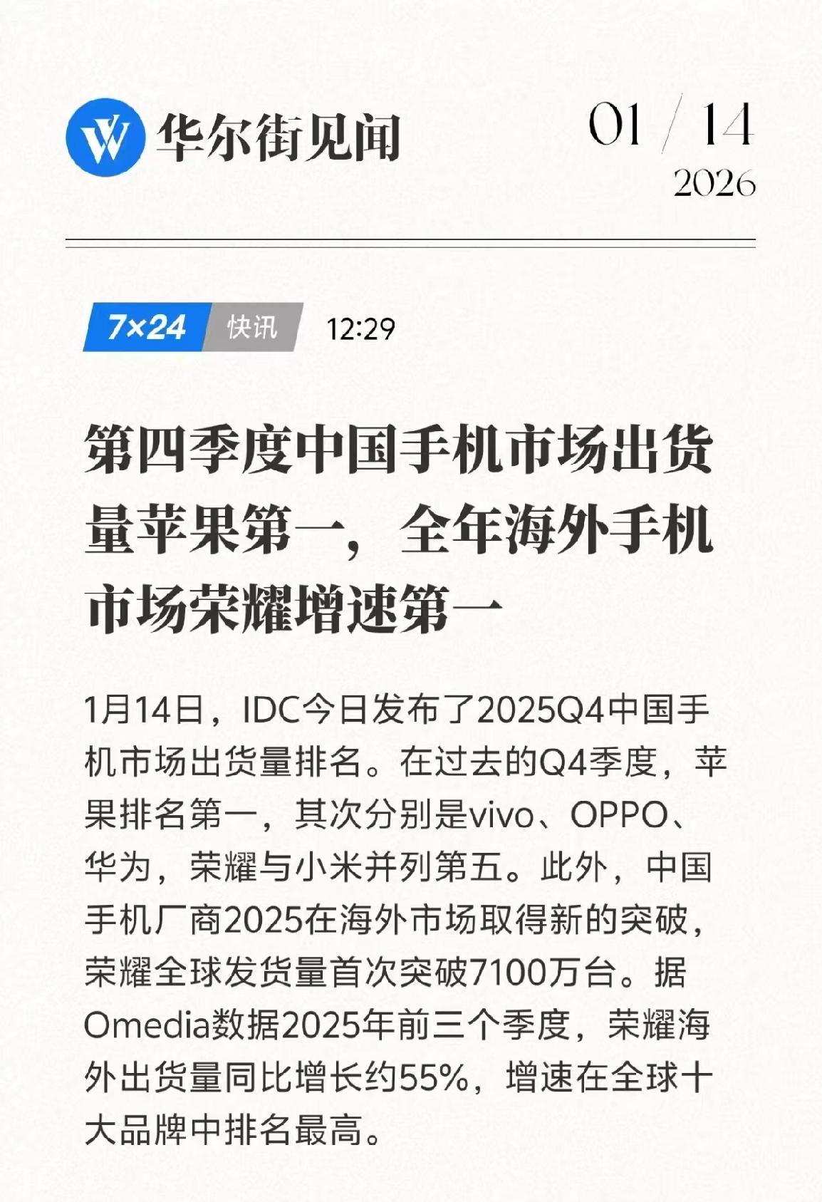 据多家权威媒体的报道,第四季度中国手机市场出货量苹果第一,全年海外手机市场荣耀增速第一。 中国手机厂商2025在海外市场取得新的突破,荣耀全球发货量首次突破7100万台。另外据Omdia数据,2025年前三个季度,荣耀海外出货量同比增长约55%,增速在全球十大品牌中排名最高,预计荣耀将成为2025全年TOP品牌海外增速第一。