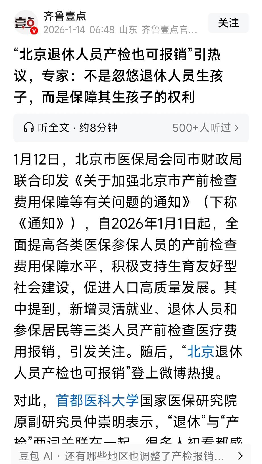 特大喜讯!自2026年1月1日起,北京退休人员产检费用可可以报销。此外,90岁以上生育者每月可领取1万元抚养费。