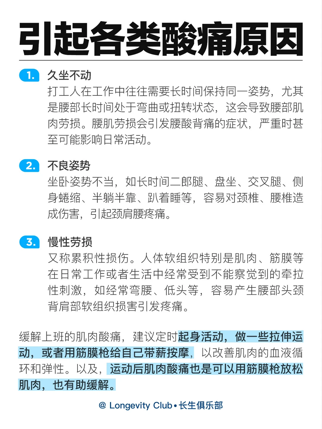 这些是导致肌肉酸痛的原因,这个时候建议大家起身活动活动,做一些拉伸运动,或者用筋膜枪给自己带薪按摩,以改善肌肉的血液循环和弹性。以及,运动后肌肉酸痛也是可以用筋膜枪放松肌肉,也有助缓解。