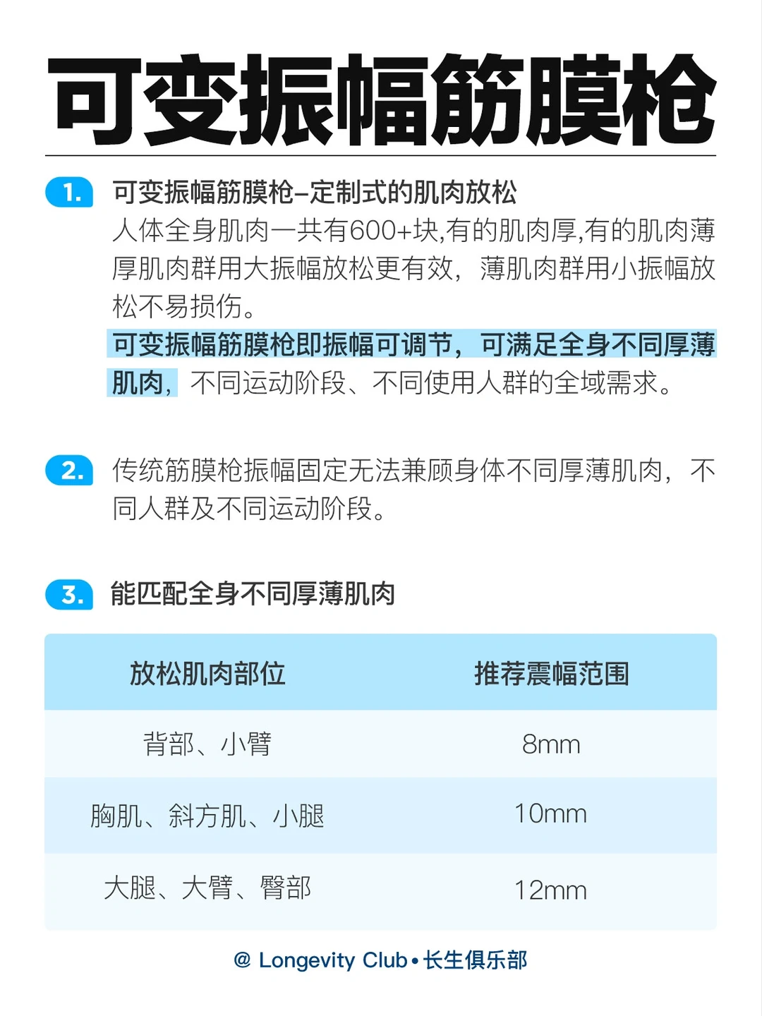 1.看振幅(打击幅度)振幅决定打击深度,但振幅不是越大越好,过小按摩不到肌肉深层,过大损伤肌肉。可变振幅比固定振幅适用范围更广。
