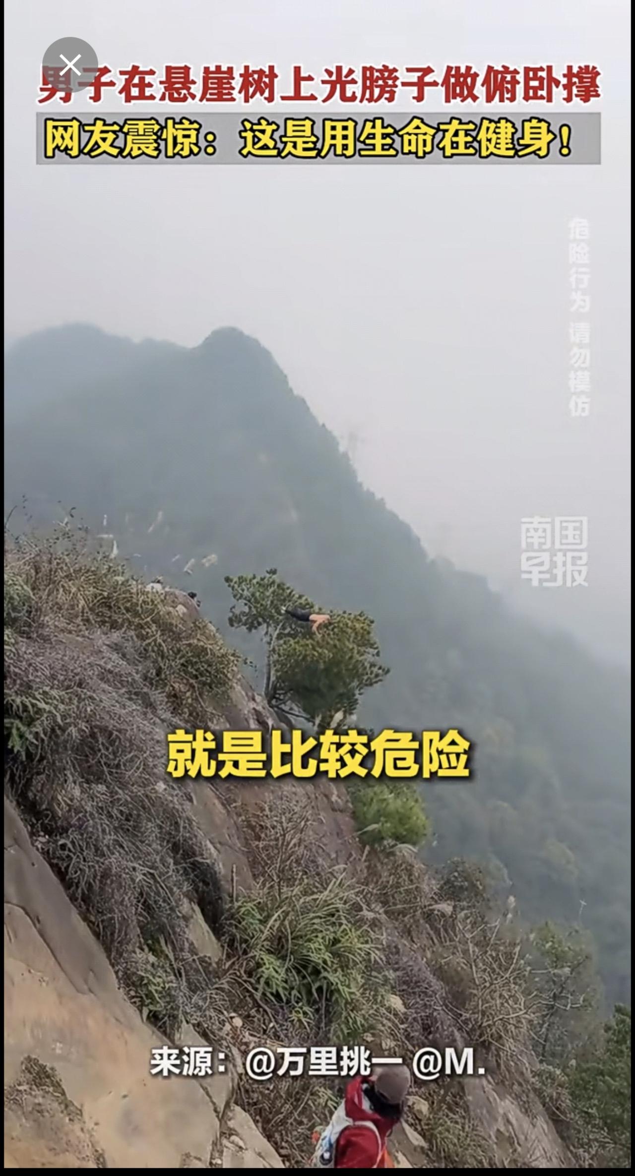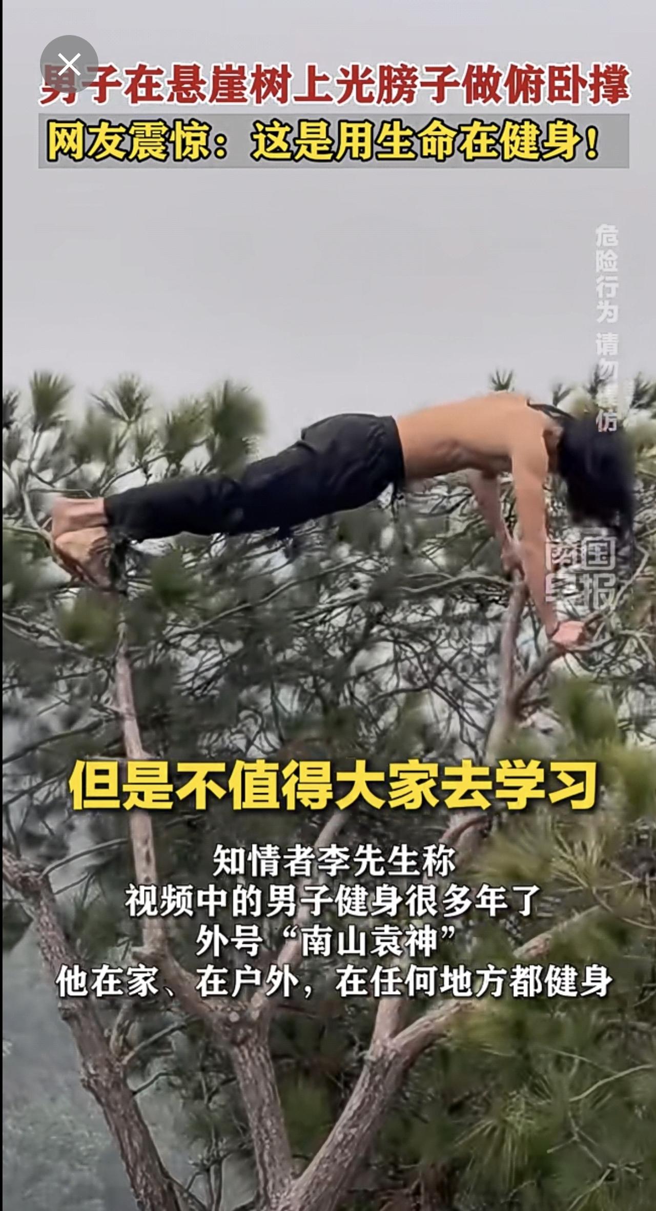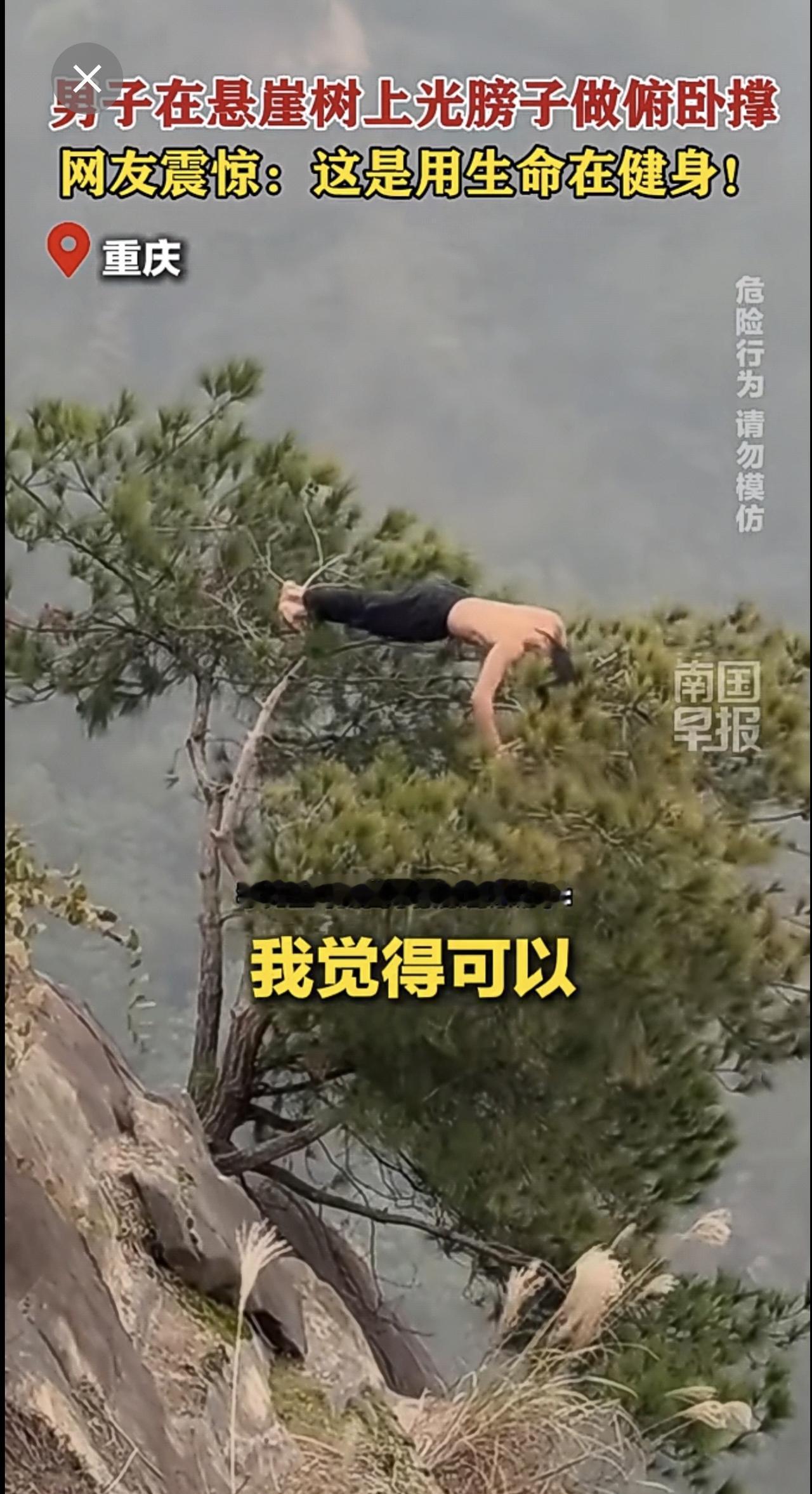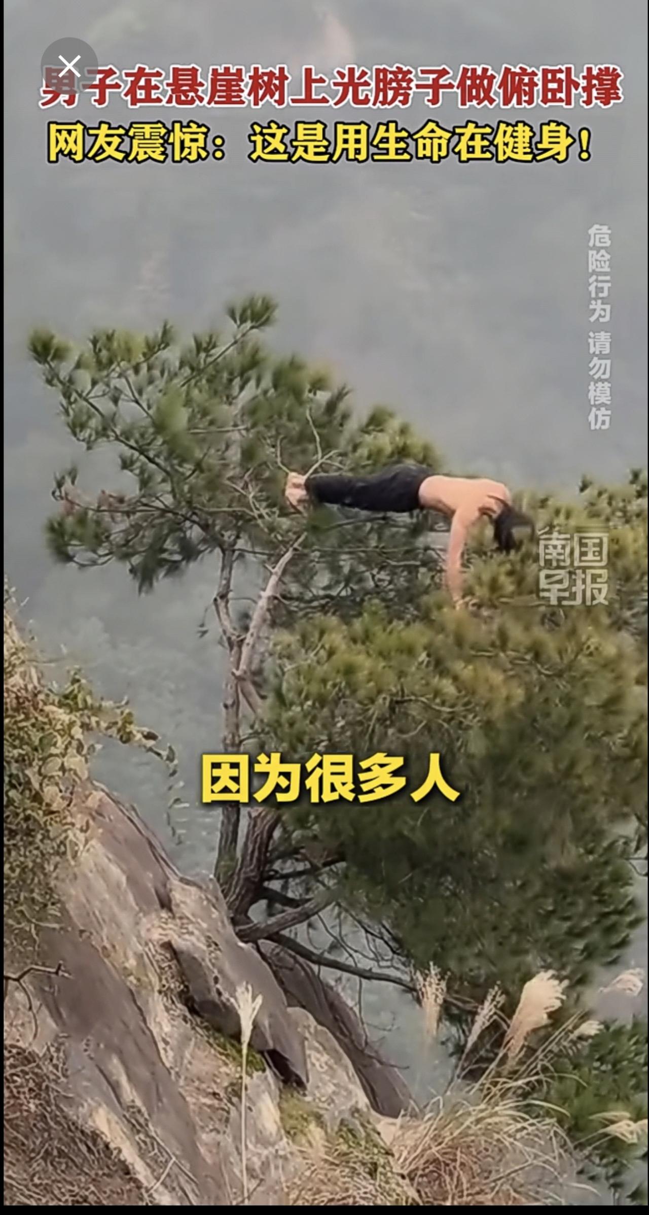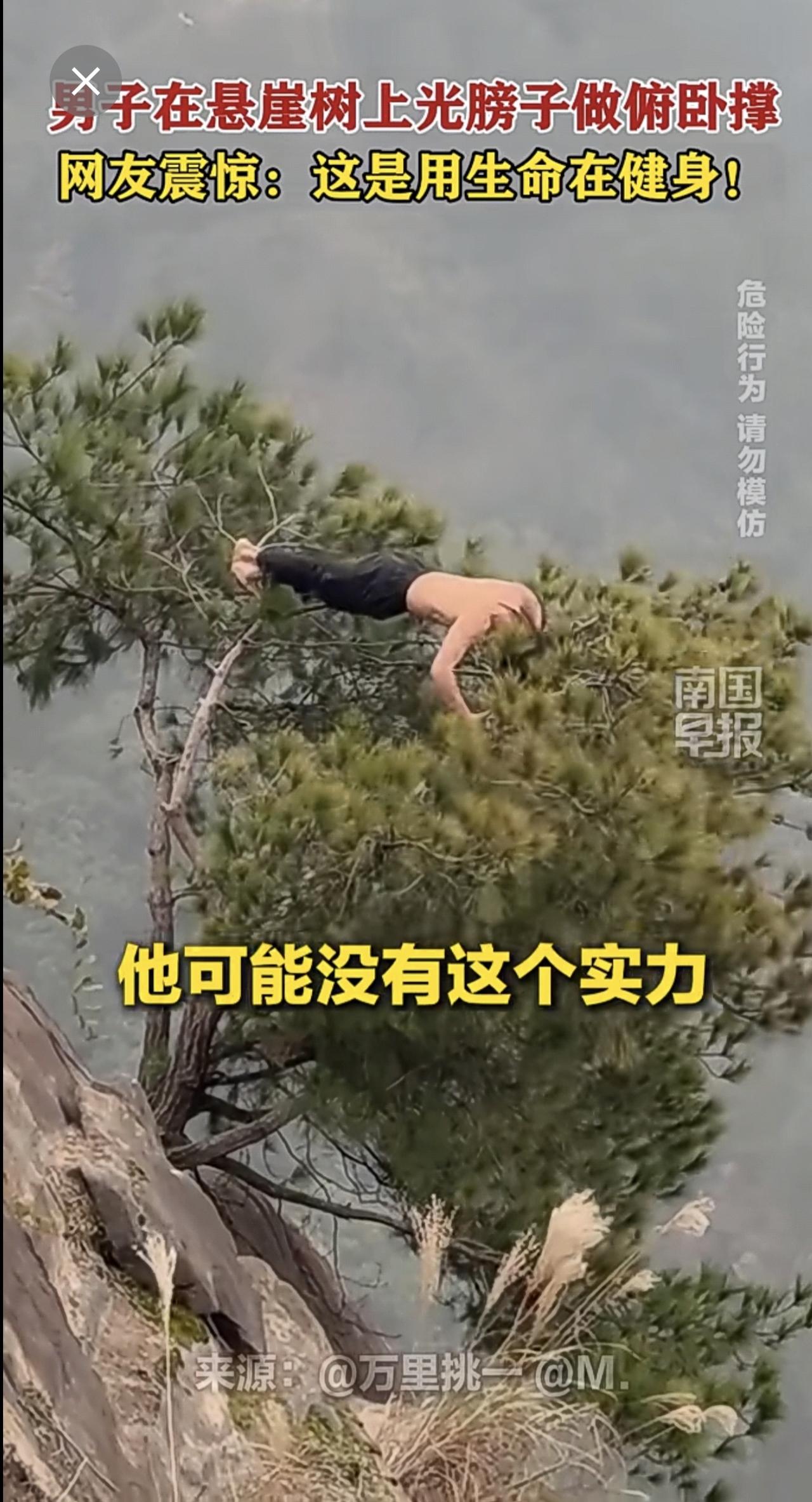 男子在悬崖树上光膀子做俯卧撑,网友震惊:这是用生命在健身!重庆俯卧撑徒步悬崖 (来源:@万里挑一 @M.,记者:曹路佳)