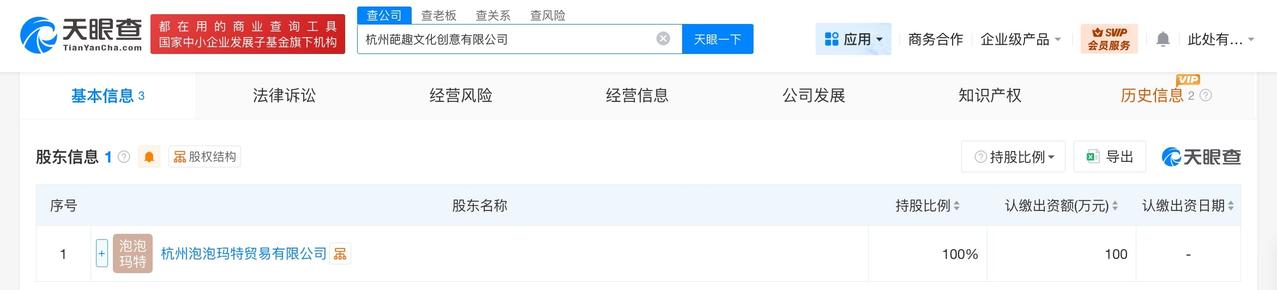 泡泡玛特在杭州成立文化创意公司注册资本100万 天眼查工商信息显示,近日,杭州葩趣文化创意有限公司成立,法定代表人为代雨茹,注册资本100万人民币,经营范围含日用百货销售、日用品销售、互联网销售、人力资源服务、商务代理代办服务、个人商务服务、电子产品销售、机械设备租赁等。股东信息显示,该公司由泡泡玛特旗下杭州泡泡玛特贸易有限公司全资持股。 天眼查信息: