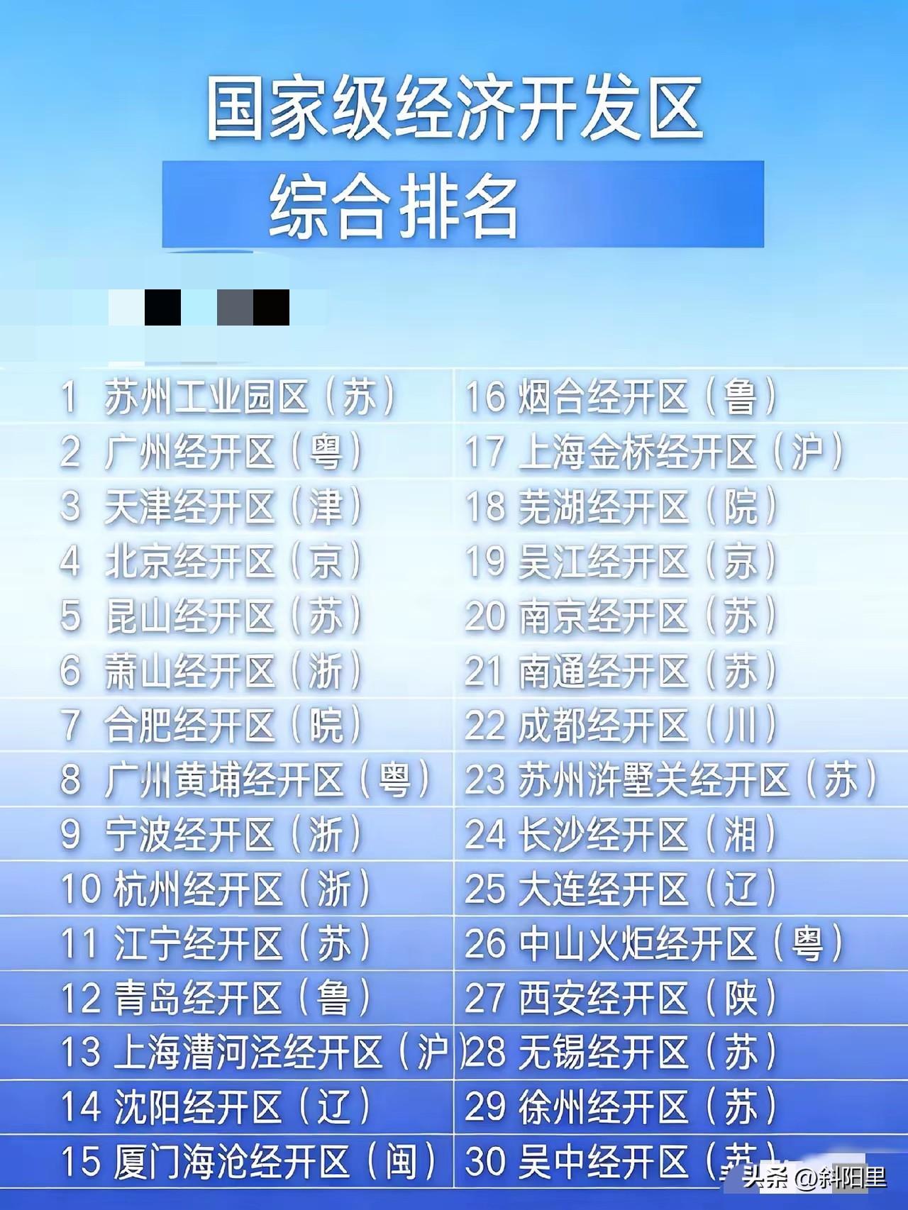 大概没想到吧,经开区作为中国最特殊的功能区,而国家级经开区就是最顶端的。在这个顶端的顶端就是苏州工业园! 在前30名国家级经开区榜单中,苏州是最多的,也不愧第一地级市的称号,辖区内有五个园区上榜。苏州工业园区位列第一,并且是连续九年蝉联榜首。这个苏州工业园区是和新加坡合作的,只有278平方公里,137万人,有16万家企业,高新技术产业占比近80%,2024年生产总值达到4000亿元,超过很多地级市。 此外,前30强主要集中在东部沿海的粤苏浙鲁省份,不过辽宁的沈阳经开区和大连经开区也入围30强。
