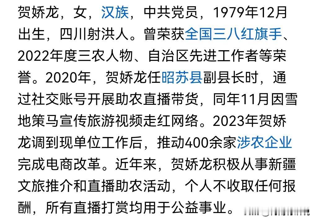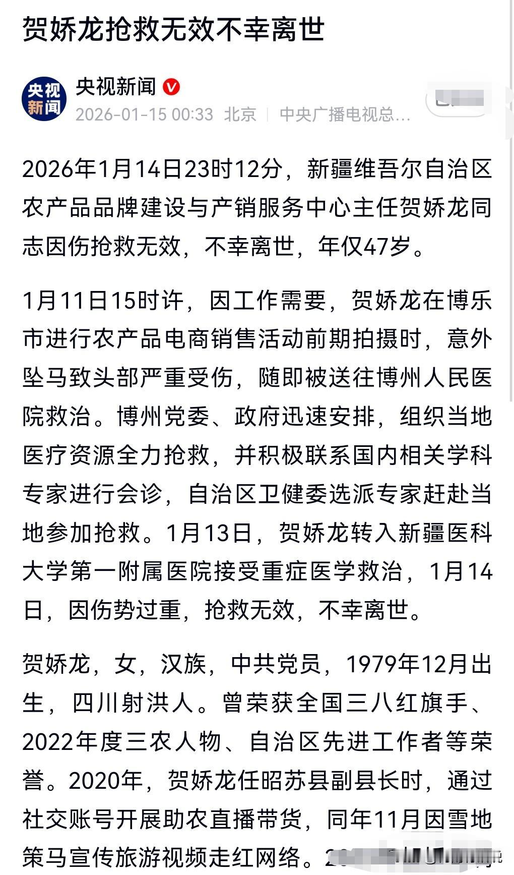 这真是天妒英才,不好了,为什么要这样残忍,没有发生奇迹,这真的是太悲剧了,这么好的一个人竟然离开了我们。 2026年1月14日23:12,贺娇龙抢救无效离世,年仅47岁。 最终因头部从马上坠地受伤,没有救活。 曾经因拍摄骑马的视频走红网络,想不到这次因为骑马而死亡。 看来骑马要戴上头盔才行。 她有一个了不起的地方,在助农方面不收取任何报酬,直播获得的收入用于公益事业。 [祈祷][祈祷][祈祷]