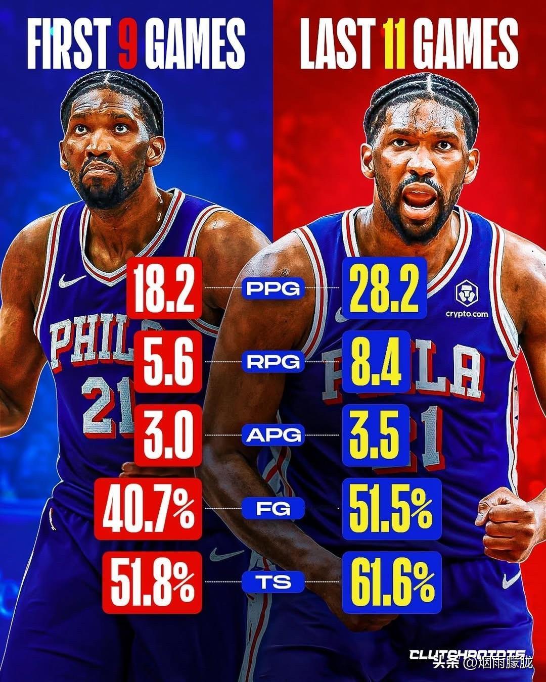 很多人都对恩比德失去了信心,是否为时过早? 恩比德,上赛季几乎没有上场机会的这位76人队大个子球员,本赛季开局状态低迷。前九场比赛,他场均得到18分,投篮命中率接近41%,之后因膝盖酸痛缺席了11月的大部分比赛。 对很多人来说,恩比德很可能再也恢复不到原来的状态,但现在看起来不一样了。 恩比德已经打了20场比赛,比上赛季的总场次还多。他刚刚在对阵猛龙队的比赛中砍下27分、8个篮板、4次助攻和2次抢断,状态又回来了。 在过去的11场比赛中,恩比德场均得到28分和8个篮板,投篮命中率为51%。 他还没完全恢复,但对76人来说,有一点很明确:过早地否定他的能力还为时过早。