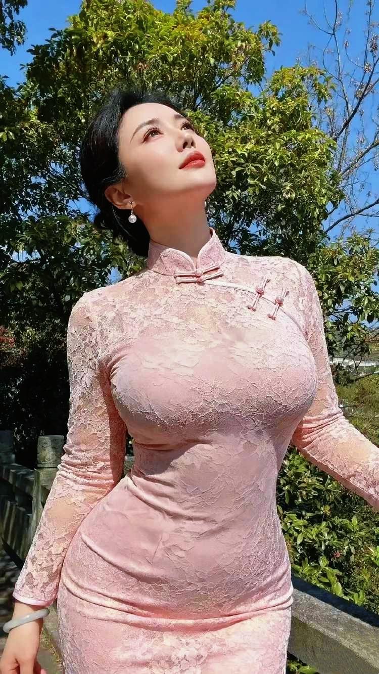 一套浅粉色蕾丝修身旗袍,尽显中年女性高贵典雅的气质,使其在人群中愈发光彩夺目。一副翠绿玉镯与洁白珍珠耳环,彰显出年轻时尚之感。 颜色鲜艳的旗袍
