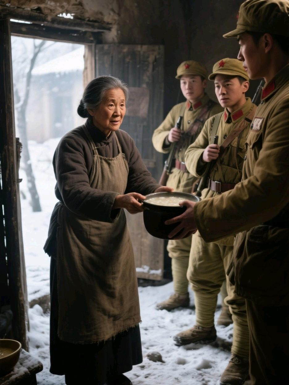 1941年老婆婆煮粥给八路军喝,排长发现不对劲大喊道:都别喝 风雪呼啸的夜晚,破旧的村舍里,周大娘颤抖的手搅动着锅中的粥,眼角滑下一滴泪。屋内,八路军战士们疲惫地等待着热粥。王排长眉头一皱,鼻子微动:"这粥...有问题!"他猛地站起,大喊道:"都别喝!" 1941年隆冬,北风呼啸,雪花如刀割着脸颊。华北某山区的密林中,张连长带领的八路军小分队正艰难前行。这支队伍本有二十余人,如今只剩下十二人,其中还有三名伤员。 战士们的棉服早已被风雪浸透,冻得硬邦邦贴在身上,每走一步都伴随着刺骨的寒意。伤员的呻吟声被风声压得很低,却像针一样扎在每个人心上——他们刚躲过日军的新一轮扫荡,粮食和药品都已告罄,能撑到这个村子已是万幸。 周大娘是村里仅有的留守老人,儿子跟着队伍参军,儿媳带着孙辈躲进了深山。看到战士们冻得发紫的嘴唇和渗血的伤口,她二话没说就把人让进了屋,转身就架起了铁锅。柴火噼里啪啦烧着,映得她满脸皱纹都泛着暖意,可那滴突然滑落的眼泪,却让一直留意周遭的王排长心里打了个突。 "大娘,您这米是从哪儿寻来的?"王排长没直接点破,一边帮着添柴一边随口问道。山区遭日军洗劫后,村民们连自己都吃不饱,哪来的余粮煮这么大一锅粥? 周大娘的手猛地一顿,搅动粥的动作慢了半拍,声音带着不易察觉的哽咽:"就...就窖里藏的一点陈米,你们打仗辛苦,该补补。" 这话刚说完,王排长鼻尖又嗅到一丝异样。不是馊味,而是一种极淡的苦涩,混在米香里几乎难以察觉。这种味道他太熟悉了——上个月在邻村,就有老乡被日军胁迫,在给八路军的干粮里掺了少量泻药,那种苦涩味和眼前的粥如出一辙! "都别喝!"王排长的喊声震得屋梁上的积雪簌簌掉落。刚伸手要端碗的战士们齐刷刷停住动作,满脸错愕地看着他。张连长也站起身:"老王,怎么回事?" 王排长舀起一勺粥凑到灯前,只见粥里浮着几颗细小的灰黑色颗粒,他捏起一粒放在指尖捻了捻,转头看向周大娘:"大娘,您说实话,是不是日军逼您这么做的?" 这句话像重锤砸在周大娘心上,她再也忍不住,瘫坐在灶台边放声大哭:"是...是鬼子!他们昨天闯进村子,说要是不帮着下药,就把躲在山里的乡亲们都揪出来枪毙...我没办法啊!可我实在不忍心害你们,煮的时候故意多放了水,还想让你们看出破绽..." 战士们瞬间沉默了。1941年的华北,日军的"扫荡"来得比风雪更凶狠,"三光政策"让无数村庄变成废墟,乡亲们夹在日军和八路军之间,稍有不慎就是家破人亡。周大娘的眼泪里,装的是被迫妥协的屈辱,更是对八路军的愧疚。 张连长走上前扶起周大娘,声音沉而有力:"大娘,我们不怪您。要怪就怪那些丧尽天良的鬼子,是他们逼着老百姓骨肉相残。"他转头对战士们说:"把粥倒了,我们再想办法找吃的,绝不能让鬼子的阴谋得逞。" 有战士不解,明明饿到头晕眼花,为什么不冒险喝一点?王排长指着门外的风雪:"鬼子既然敢这么做,就不会只下泻药这么简单。说不定这药里还掺了让人丧失战斗力的成分,我们要是中招,不仅救不了乡亲,还得把自己搭进去。" 那天晚上,战士们最终靠着周大娘偷偷塞给的几把炒面,就着雪水勉强果腹。天没亮,他们就悄悄离开了村子,临走前给周大娘留下了仅有的两块银元——那是他们省下来准备给伤员买药的钱。 后来他们才知道,日军果然在村外设了埋伏,就等着八路军喝下药粥失去抵抗力后一网打尽。而周大娘因为"任务失败",被日军带走关了半个月,受尽了折磨,直到老乡们凑钱才把她赎回来。 战争年代的人心,远比风雪更复杂。有日军的残暴,有汉奸的卑劣,却更有像周大娘这样的乡亲,在绝境中用自己的方式守护着八路军。王排长的警觉救了整支队伍,而周大娘的眼泪,则让我们看到了军民鱼水情最真实的模样——不是口号,而是危难时刻的相互体谅,是明知不可为而为之的善良。 各位读者你们怎么看?欢迎在评论区讨论。