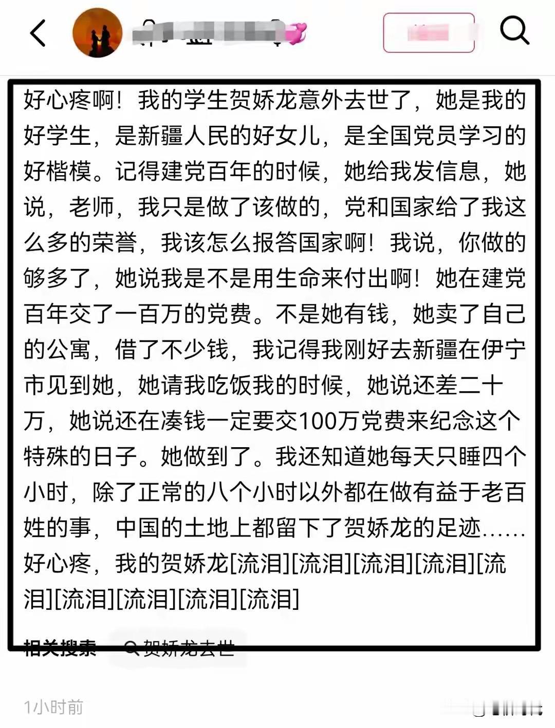 辟谣不过24小时,噩耗传来,47岁贺娇龙去世,初中老师透露,去世前靠机器维持心跳,曾卖房拿出100万交党费,将葬在昭苏父亲身旁! 在1月11日下午,因为工作需要,贺娇龙在农产品电商活动前期拍摄时,意外从马背坠落,导致头部严重受伤。 昨天白天看到新疆官媒辟谣,很好奇:哪个网红这么有面子?特意了解了一下,才知她的事迹,她最终离去,令人难过。 对新疆旅游和农产品推销贡献最大的网红,为宣传新疆、推广新疆的农产品,贺主任无私奉献,新疆需要这样的好干部,但天妒英才。 她的初中老师透露贺娇龙曾经卖房凑钱缴纳百万党费,每天只睡四个小时。墓地选在了昭苏公墓,将葬在她父亲身旁。 雪落无声,山河呜咽。贺娇龙生命定格在了工作途中,却将精神永远留在了新疆的草原与星空。 她的热爱与坚守,将化作照亮基层工作者前行的光。 敬业精神可敬,只是流量时代还是要注意安全的,凡事有度也有个极限。