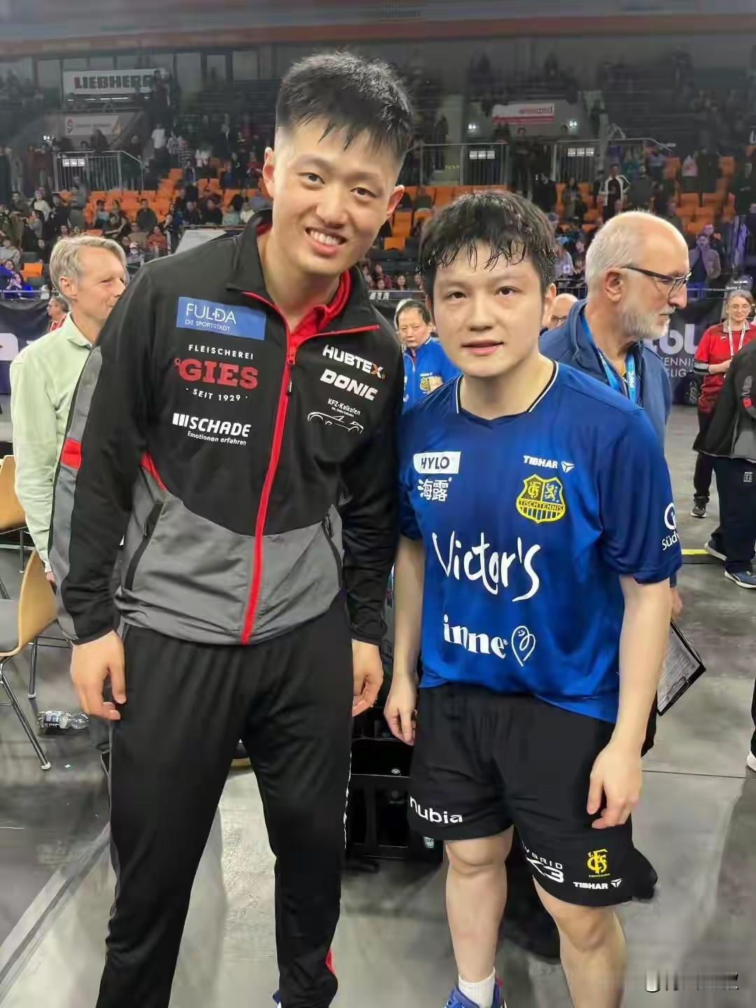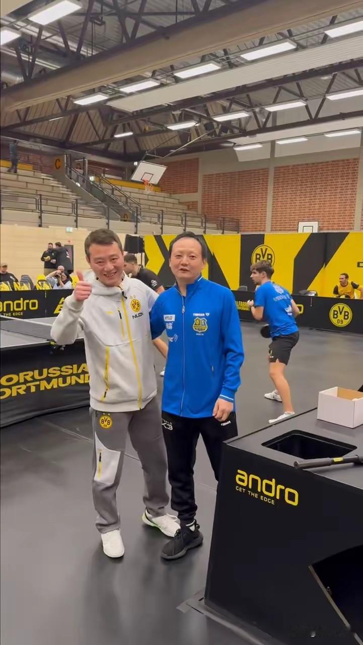 樊振东在德甲越来越适应了! 因为德甲中国人越来越多了! 大家打比赛, 顺便还能串门子! 萨尔布吕肯和多特蒙德之战, 对方教练祁指导, 原来是八一队, 这次过来打比赛, 和王志小胖聊天! 德国杯时 孟凡博父子也来找东哥合影, 还有邱党父子也在征战德甲! 德甲比赛赛场激烈, 赛后大家相亲相爱一家人, 球迷也很理性, 保留着乒乓球竞技体育的火种!