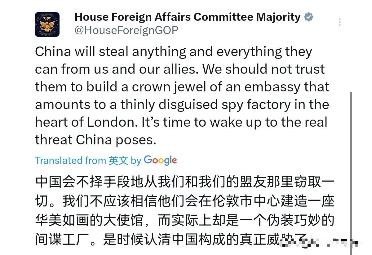 美国众议院外交事务委员会对我们放话了!1月14日,美国众议院外交事务委员会声称,中国会从我们和我们的盟友那里“窃取”任何东西。我们不应该相信他们会在伦敦市中心建造一座皇冠上的明珠般的大使馆,它相当于一个几乎不加掩饰的“间谍”工厂。是时候意识到中国构成的真正“威胁”了。 所谓中国“窃取”盟友东西的说法,纯属无稽之谈,稍微翻下公开数据和权威报道就能戳破。这些年中国在科技创新领域的进步有目共睹,但这份进步从不是靠什么所谓的“窃取”,而是靠实打实的投入和科研人员的埋头苦干。 光每年给美国等国家支付的知识产权费用就接近三百亿美元,每一分钱都给得明明白白,完全按照市场经济规则来,这要是算窃取,那全球企业怕是没人敢跟中国合作了。 再看创新领域的硬数据,世界知识产权组织的报告早就显示,中国是《专利合作条约》框架下国际专利申请的第二大来源国,国内受理的发明专利申请量甚至超过了美国、日本、韩国和欧洲专利局的总和。 华为、中兴这些企业每年提交的专利申请数量常年位居全球前列,2017年中国研发投入占GDP的2.1%,成为仅次于美国的全球第二大创新投入国。 这些数据都是国际社会公认的,不是中国自己吹出来的,美国拿不出任何一份有说服力的证据证明这些专利和技术是偷来的,反而动辄拿所谓的“301调查”造谣,说白了就是见不得中国发展快。 再说回所谓的使馆是“间谍工厂”这种说法,更是让人觉得可笑。中国驻外使馆的建设和运作,全程都遵循国际法和驻在国的相关法律,每一个环节都有严格的规范和审批流程。 外交部出台的《领事认证办法》里,从使馆人员资质到文书认证程序,都规定得清清楚楚,目的就是促进对外交往、保障合法权益,跟所谓的间谍活动没有半毛钱关系。 伦敦市中心的中国使馆,本质上就是为了服务两国正常的外交和民间交流,方便处理领事事务、促进经贸合作,所谓“皇冠上的明珠般的间谍工厂”,不过是美国为了抹黑中国编造的戏剧化说辞。 看看美国自己的操作就更清楚了,他们才是把驻外使馆当成间谍据点的老手。美国驻巴格达大使馆,面积比联合国纽约总部大6倍,比美国驻北京大使馆大10倍,里面足足挤着1.5万名工作人员,每天消耗的生活物资都要10辆卡车运送。 按照正常外交职能,战乱中的伊拉克根本不需要这么大规模的使馆,可美国不仅建了,还常年通过这个使馆向全球各地的使领馆运送大量货物,货运清单上写的是家具、电器这些日常用品,可谁都知道,没人会用外交途径跨大洲寄送这些普通物件。 有调查记者早就披露,这个使馆其实是美国在中东的秘密行动指挥中心,不仅协调对叙利亚反政府武装的武器援助,还组织军事顾问进入叙利亚训练情报人员。 更有意思的是,美国驻法兰克福领事馆曾被曝光专门为其他使领馆代购、邮寄间谍器材,而驻巴格达大使馆被怀疑是这些间谍器材的全球集散点,把钢笔、眼镜、衬衫纽扣这些不起眼的东西伪装成日常用品运送,真实用途全是战术间谍装备。 自己干着全世界最明目张胆的使馆间谍活动,却反过来指责中国使馆是间谍工厂,这种双重标准真是刷新底线。 美国之所以这么费劲地抹黑中国,本质上就是怕中国的发展威胁到他们的霸权地位。拿不出像样的竞争手段,就只能靠造谣抹黑来混淆视听。所谓的“中国威胁”,不过是美国为了遏制中国发展制造的借口,他们真正害怕的,是失去自己在全球产业链和科技领域的垄断优势。 可事实不会因为他们的造谣就改变,中国的发展靠的是自己的努力,驻外使馆的职能是促进交流,这些都不是美国几句抹黑就能改变的。