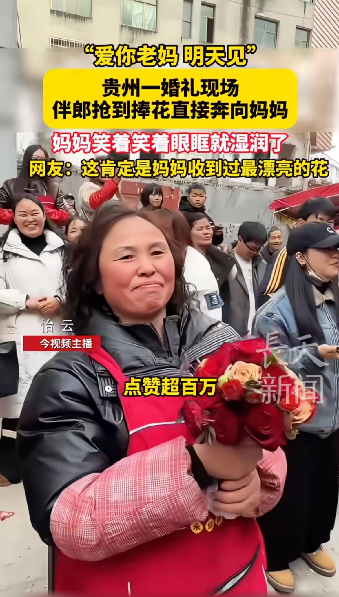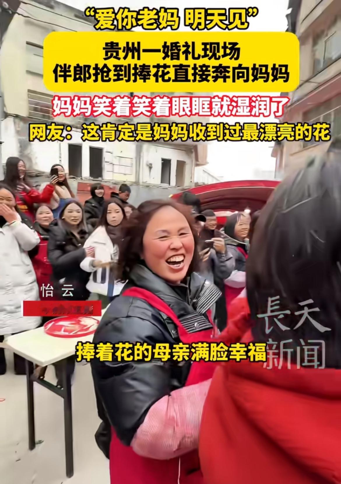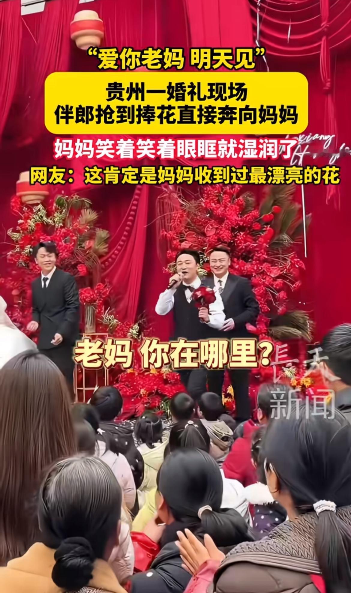 贵州一场婚礼上,有个感人瞬间火到了人民日报。新娘抛出捧花时,司仪说要送给最爱的人,伴郎郑先生眼疾手快抢到手。大家都以为他会送恋人,结果他拿起话筒大喊“老妈,你在哪里”,然后穿过人群把花送到穿围裙帮忙的妈妈手里。 妈妈先是笑开了花,接着眼里泛起泪花。原来,郑先生六岁住校,妈妈做卖鱼生意,忙得顾不上他。小时候他发烧都自己扛。这束捧花打破我们对妈妈只围着柴米油盐转的认知,让我们看到妈妈也渴望浪漫与爱,这温馨一幕全网泪目。