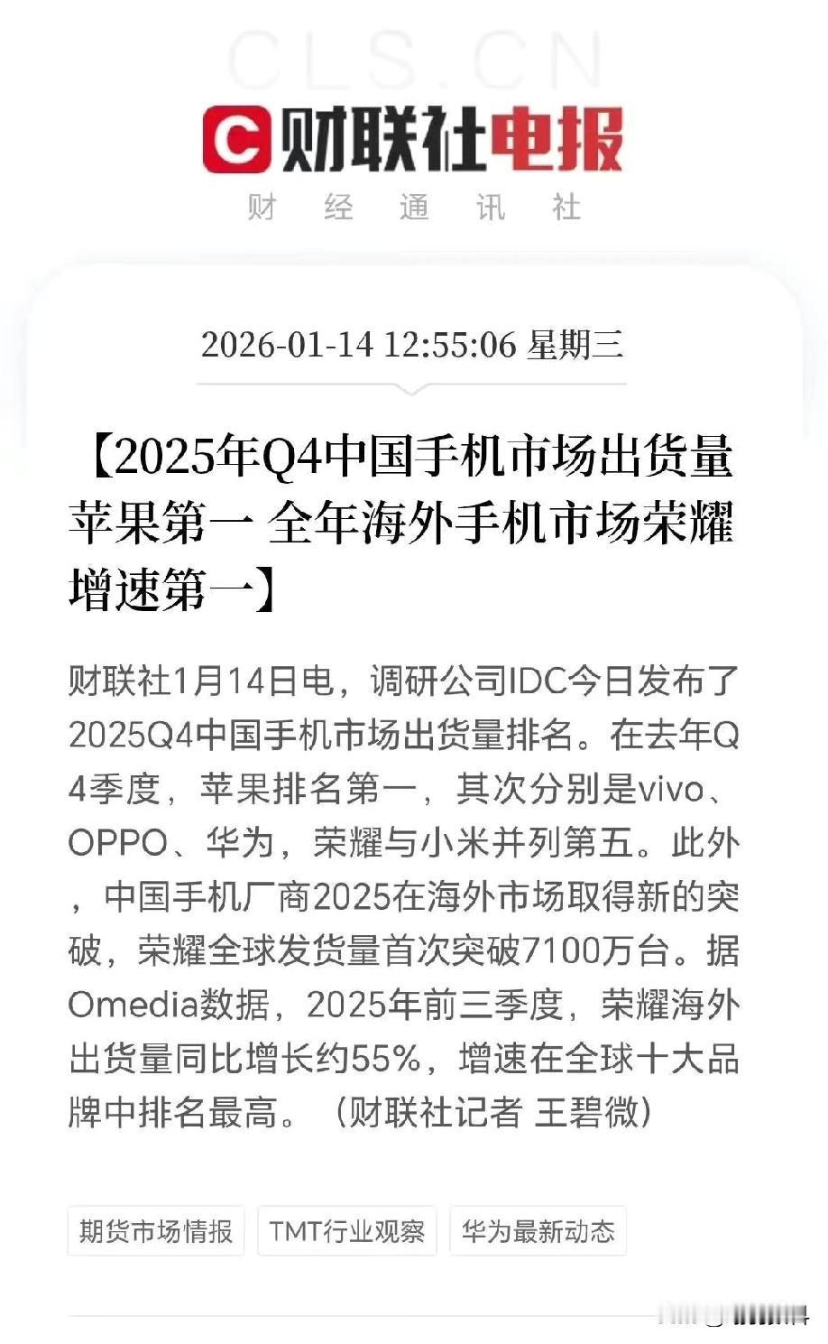 荣耀登顶国产海外手机 中国品牌增速第一 自二零二五年四季度起 荣耀不断预热发布新机 新机营造的热度 始终未曾停歇 同时 荣耀还有诸多创新亮点 以大容量电池为例 荣耀稳居国产智能手机 大容量电池第一梯队 其他厂商在电池容量方面 短期内恐难迅速追赶 这便是荣耀的优势所在 以荣耀当下的态势 2026年必将让华米OV四家中 至少一家排在其后
