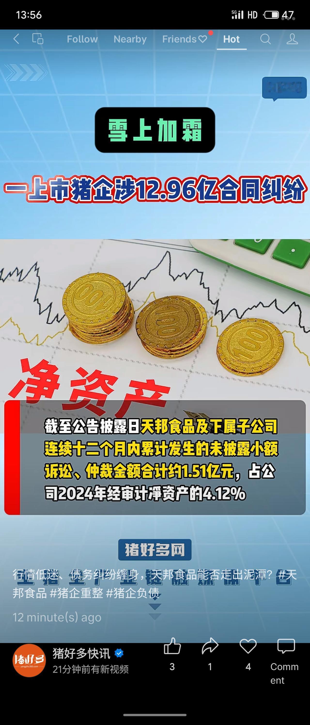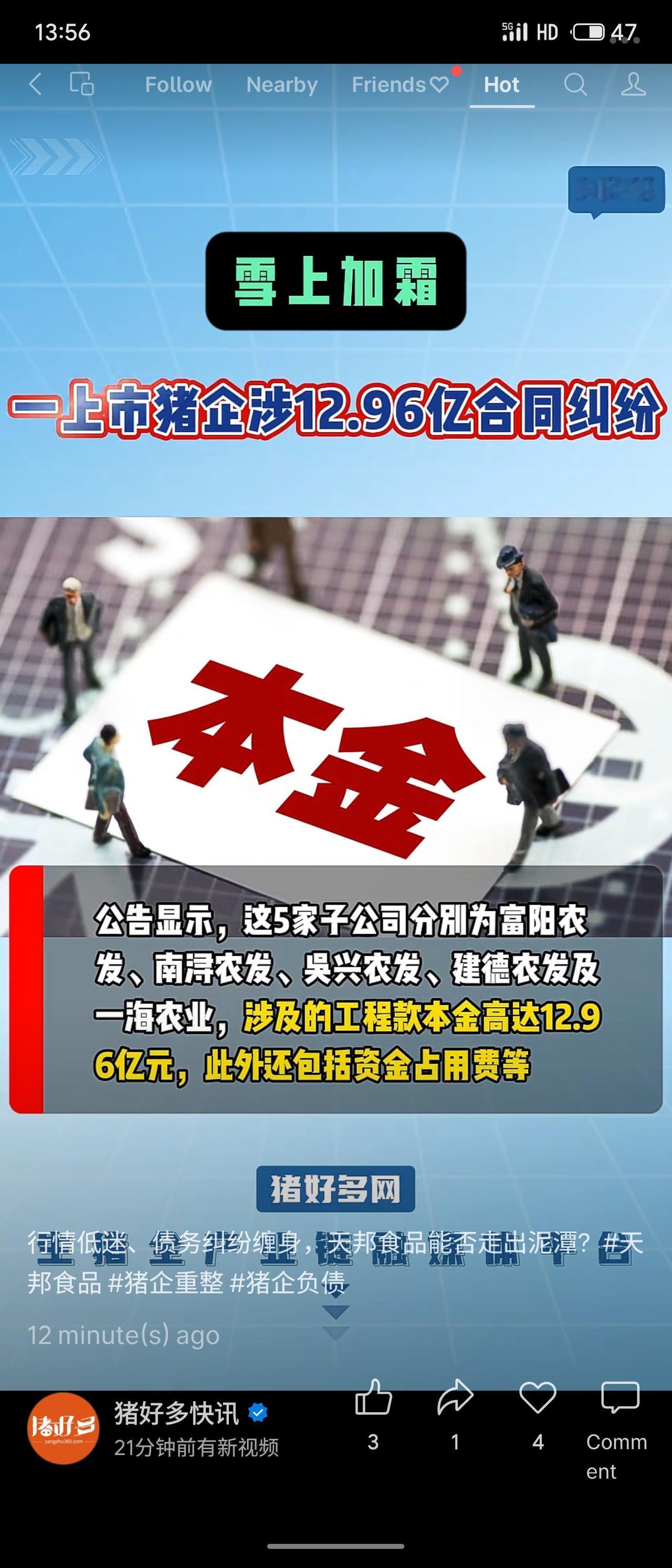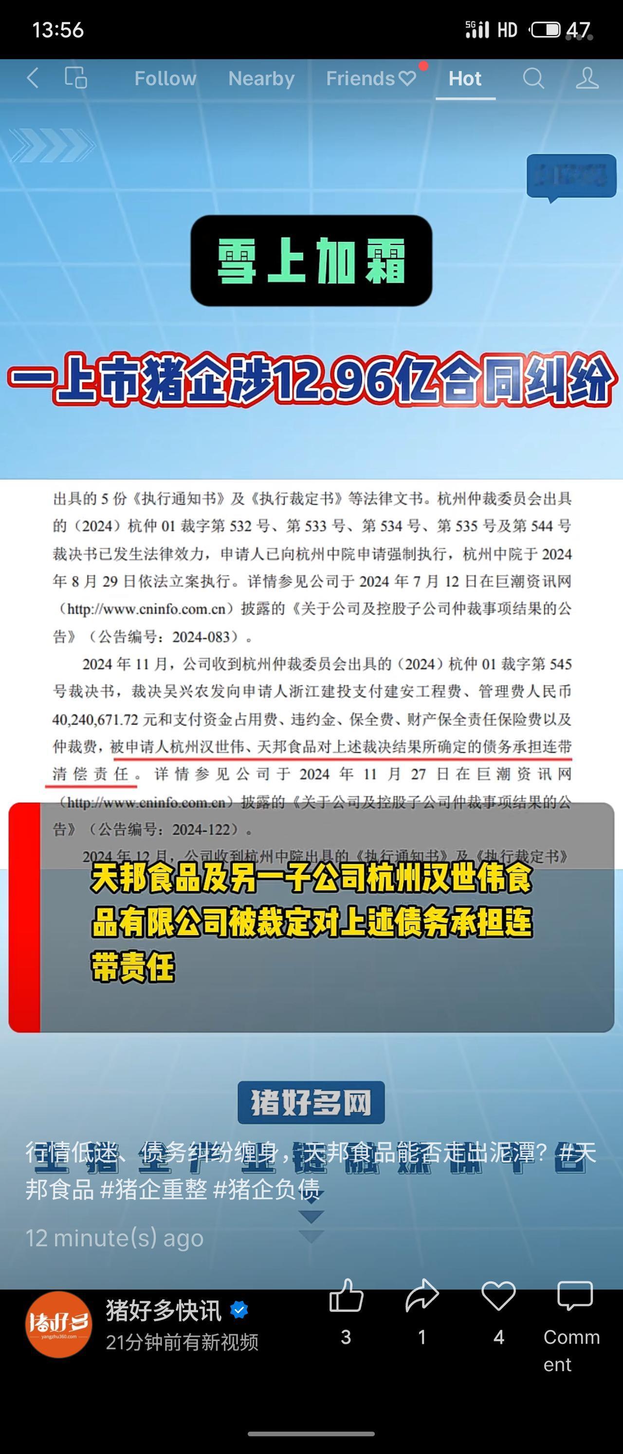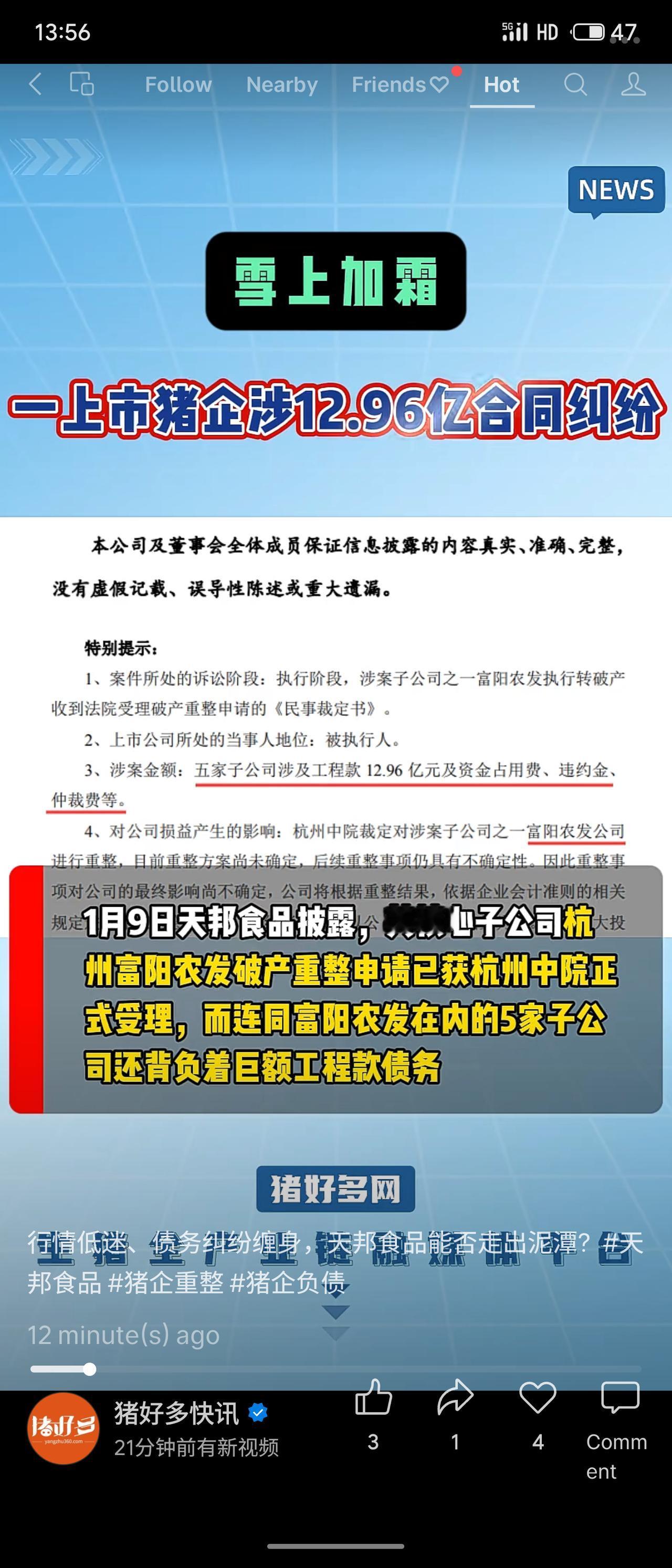 天邦食品陷入严重债务危机,其五家子公司涉及高达12.96亿元的工程款合同纠纷,已进入法院强制执行及破产重整程序。公司及其关联方需承担连带清偿责任,同时另有超1.5亿元的其他诉讼。在生猪行业低迷的背景下,其偿债能力与经营前景面临严峻考验。