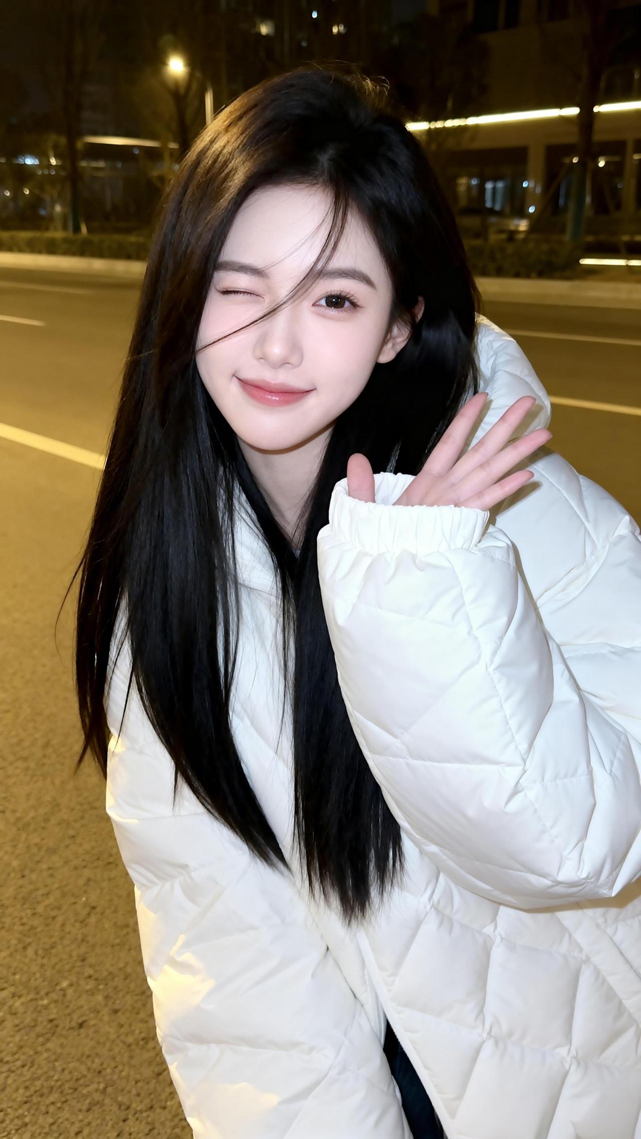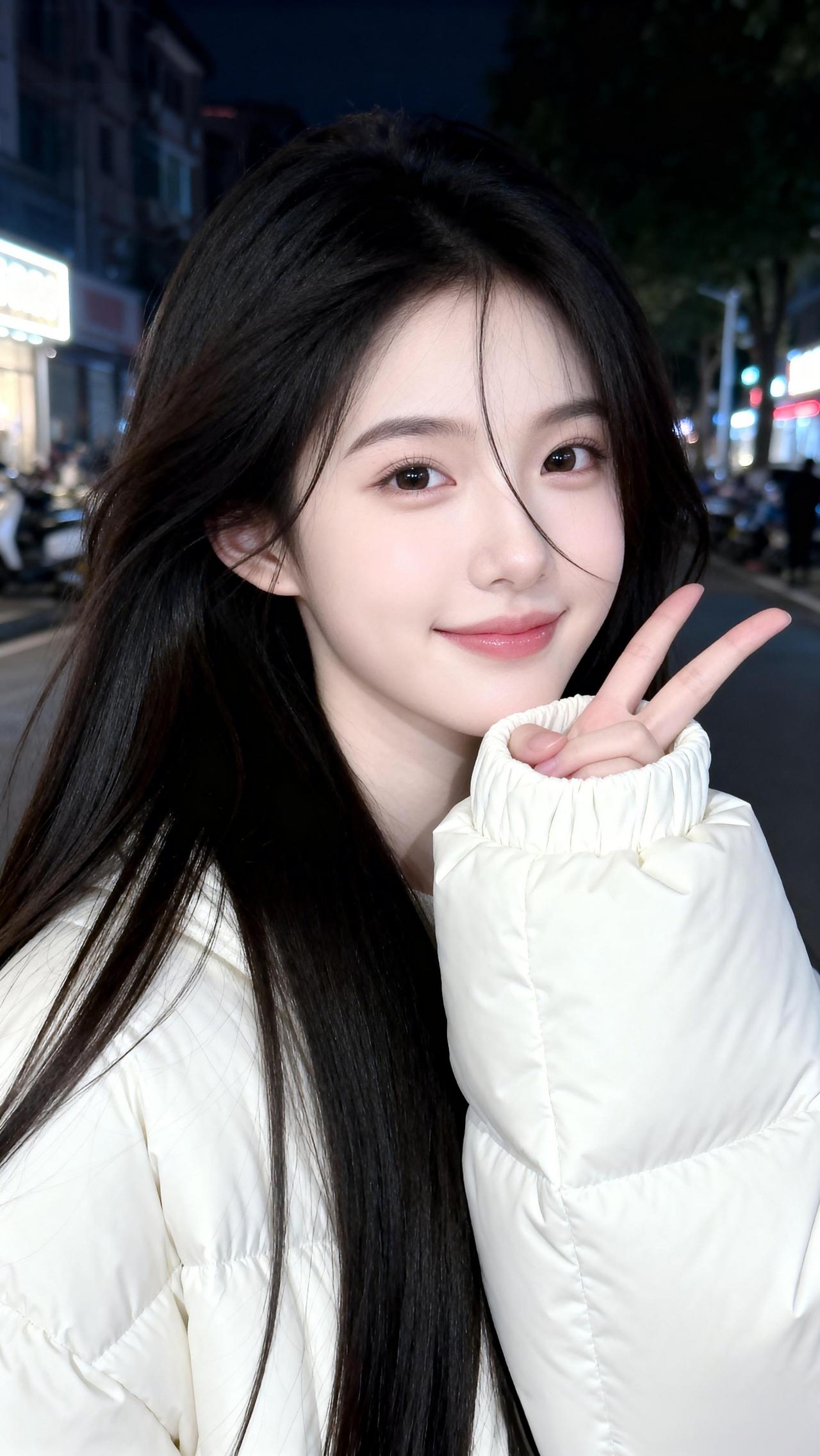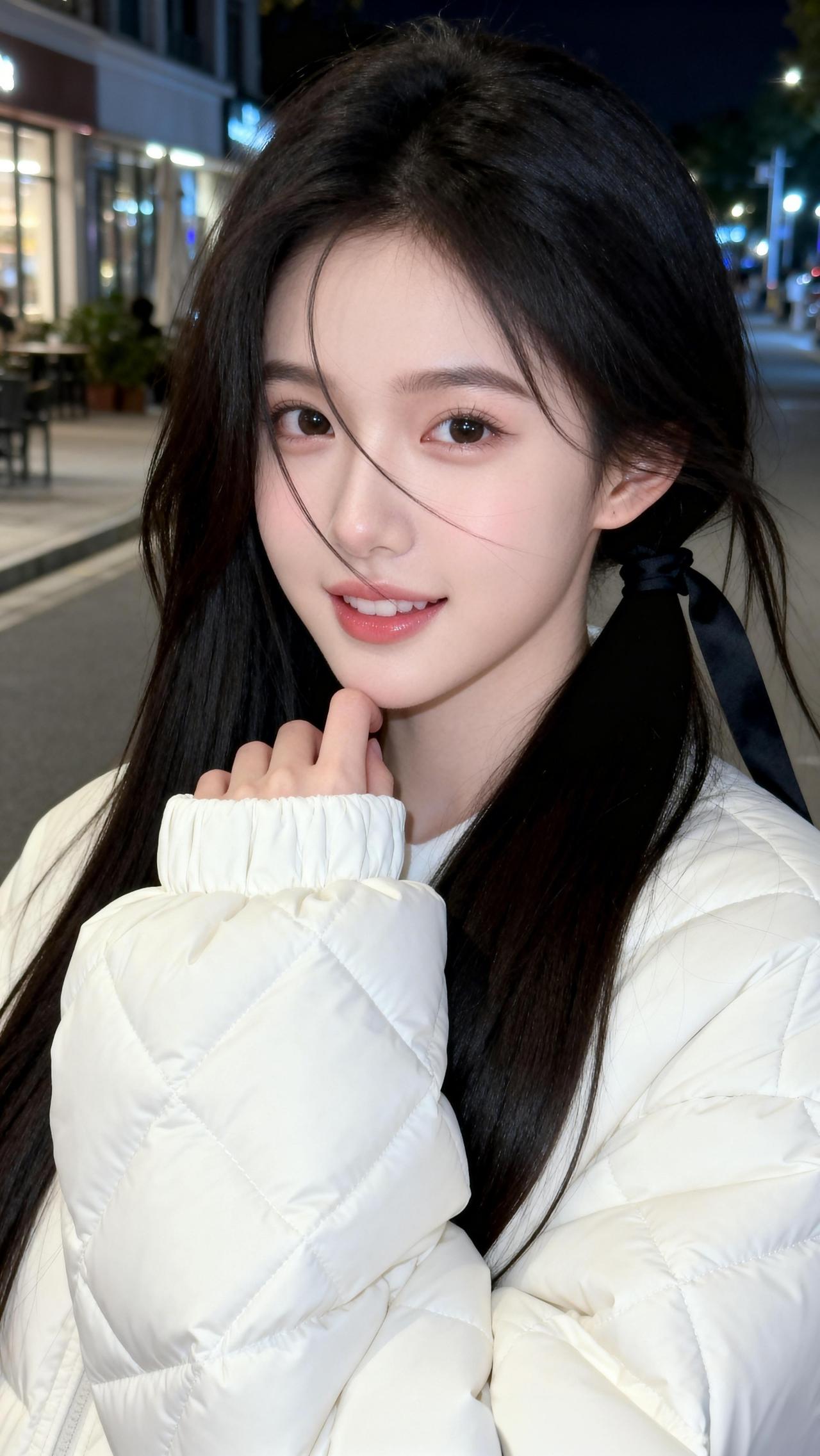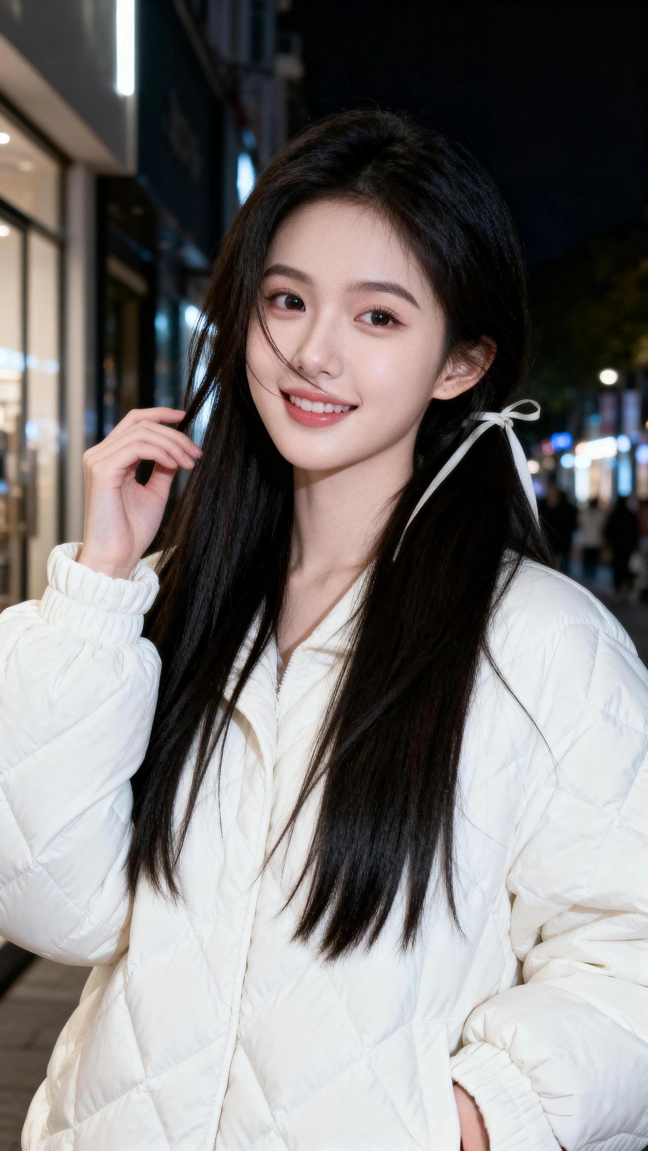夜晚街头的温柔少女,白色羽绒服搭配黑色长发,温暖而迷人。韩版白色羽绒服 温柔风羽绒服女
