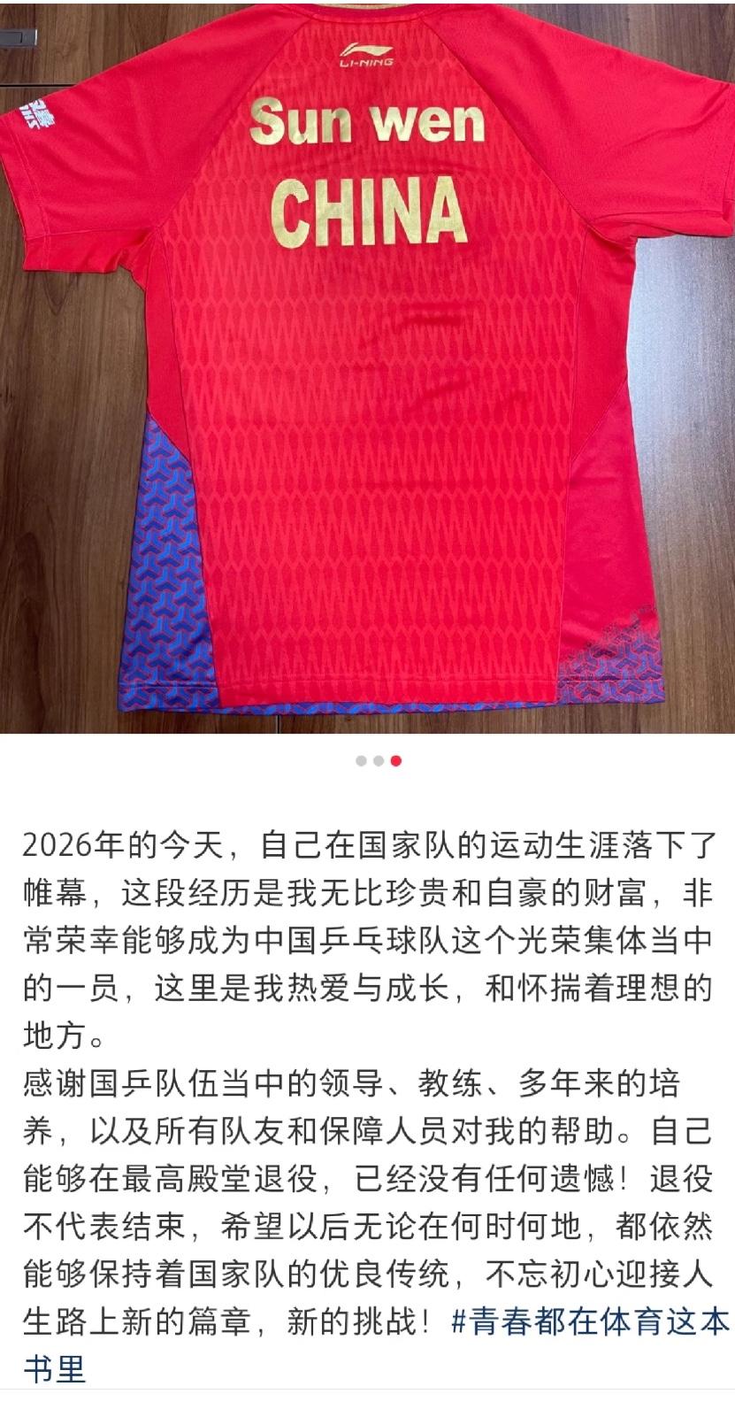 孙闻发文退出国家队—2026年的今天 自己在国家队的运动生涯落下帷幕! 1月15日,1997年出生的孙闻 宣布退出国家队, 国乒运动员人才济济, 97年出生的运动员也就28岁, 其实在2025的11月的全运会上, 孙闻表现出色, 只是在男单1/16比赛中, 0:4不敌林诗栋, 看孙闻的球风非常迅猛, 这个年纪还可以去国外打球, 生活不止只有乒乓球, 但这么多年的职业生涯谁也 不能割舍, 那就用自己的特长 做自己喜欢的事情, 为推广乒乓球运动发光发热吧!