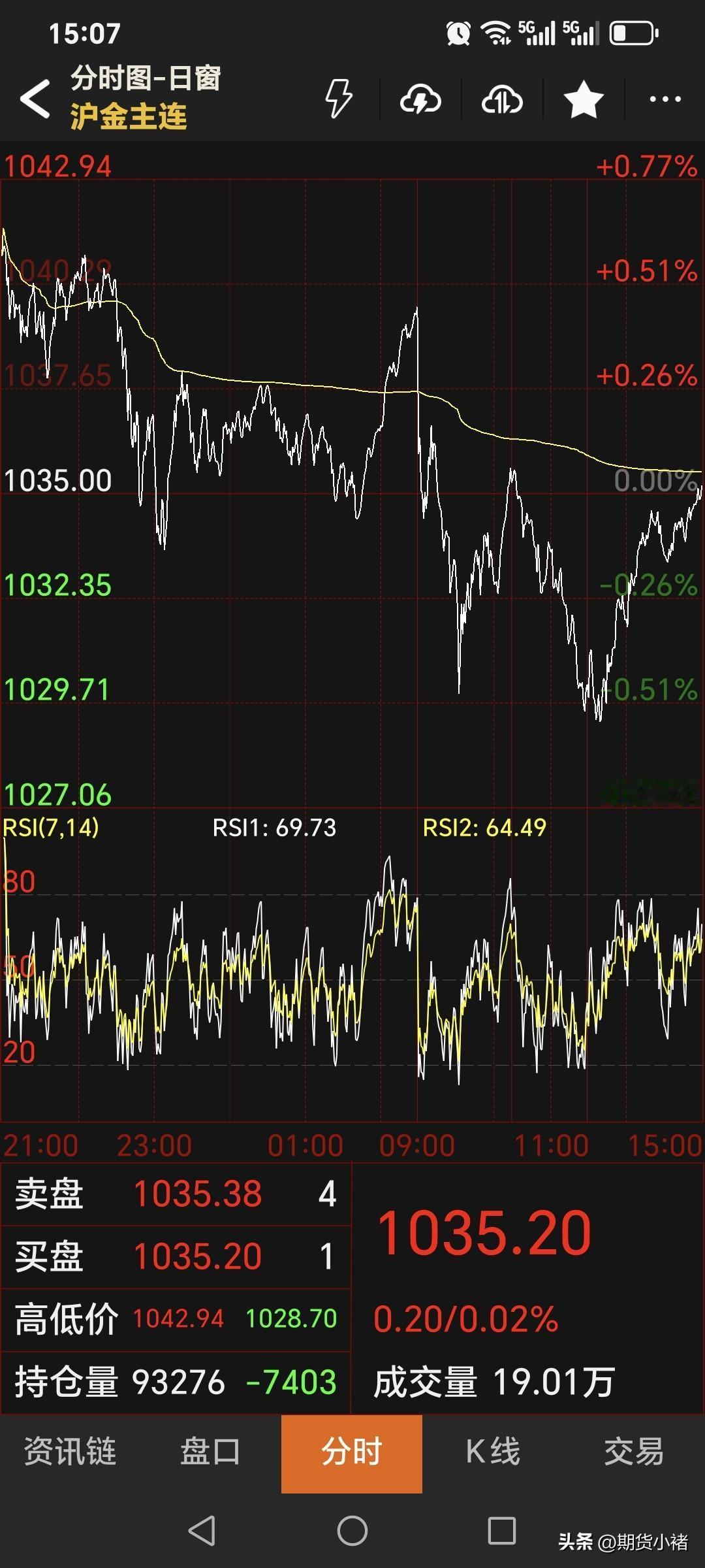 周四, 国内黄金期货震荡运行, 主力合约收盘于1035.2元, 较上一日上涨0.2元, 涨幅仅为0.02%。 这是近期连续第四天上涨。 对于黄金期货, 期货小褚认为 上方压力比较大, 谨防回调行情发生!