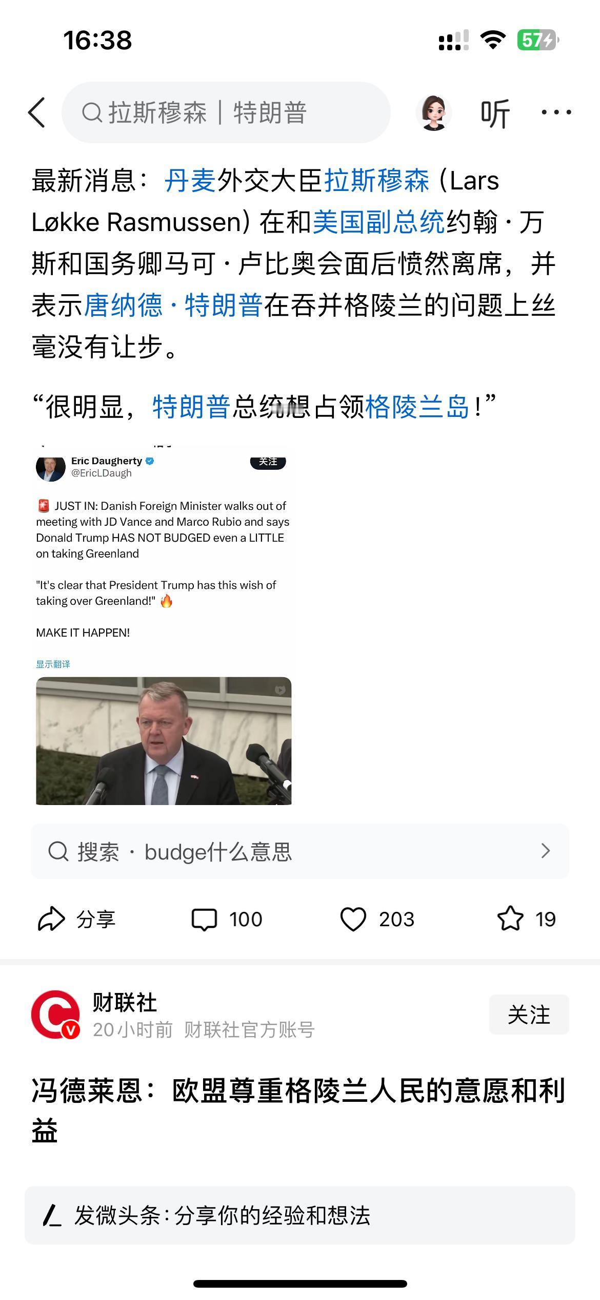 看来丹麦还想对美国强要格陵兰岛稍微挣扎一下。 结果美国副总统万斯和国务卿鲁比奥上来就是大逼斗,直接让丹麦外交大臣坐不住,来个愤然离席! 因为特朗普就是要强占格陵兰岛,毫无妥协的余地!毕竟特朗普就是说,丹麦不要不同意,不同意那我们就占领它!如此说来丹麦确实不能忍!