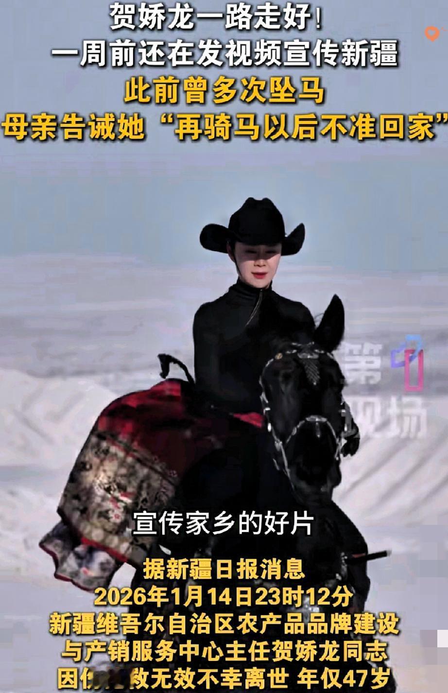 一袭红袍成绝响,安全永远不该为“效果”让步 47岁贺娇龙的离世,让多少人对着那袭雪地策马的红袍湿了眼眶。 母亲早早就骂着不准她骑马,可她为了推广家乡,一次次冒着风险上阵,最终还是没能躲过意外。 业内人士的话戳中要害:马术护具从不是摆设,头盔就是生命最后一道防线。 回看她的诸多视频,鲜少见到护具的身影,或许是为了画面美观,或许是心存侥幸,但风险从不会因为初心美好就网开一面。 她的拼劲让人敬佩,可这场悲剧也该敲响警钟:再伟大的热爱和责任,都得建立在安全的基础上。 忽视防护不是勇敢,而是对自己和身边人不负责任。 你觉得工作中该如何平衡敬业与安全?来评论区聊聊你的看法~