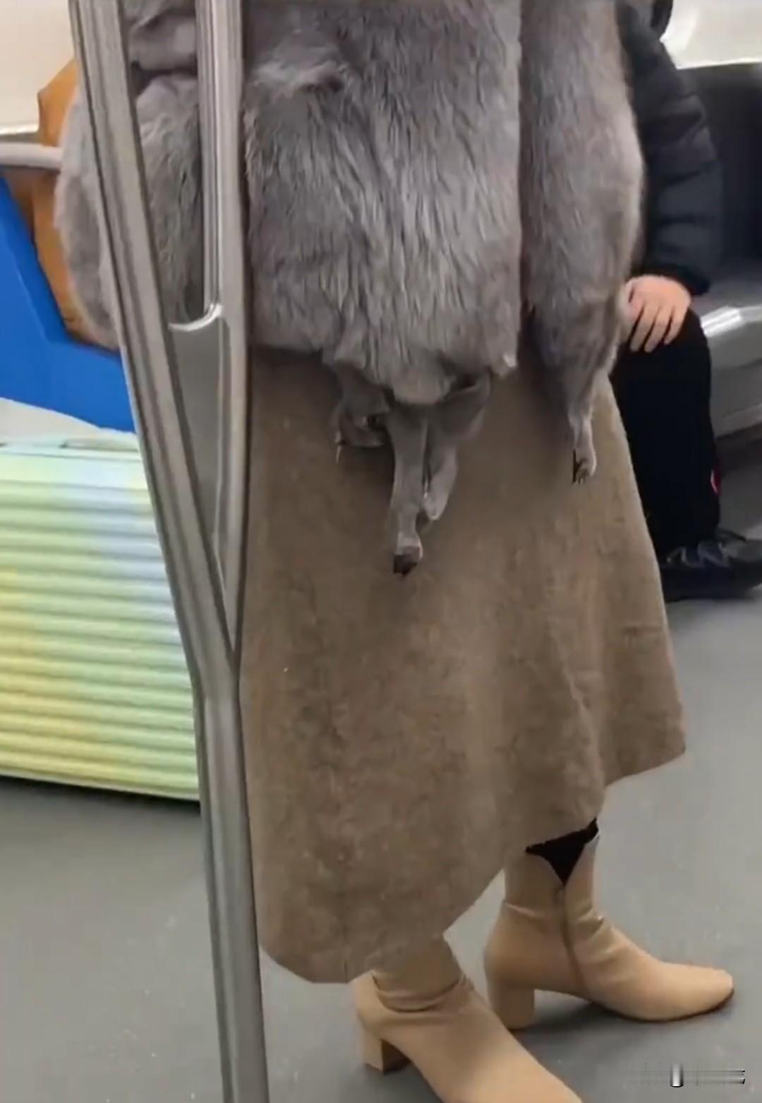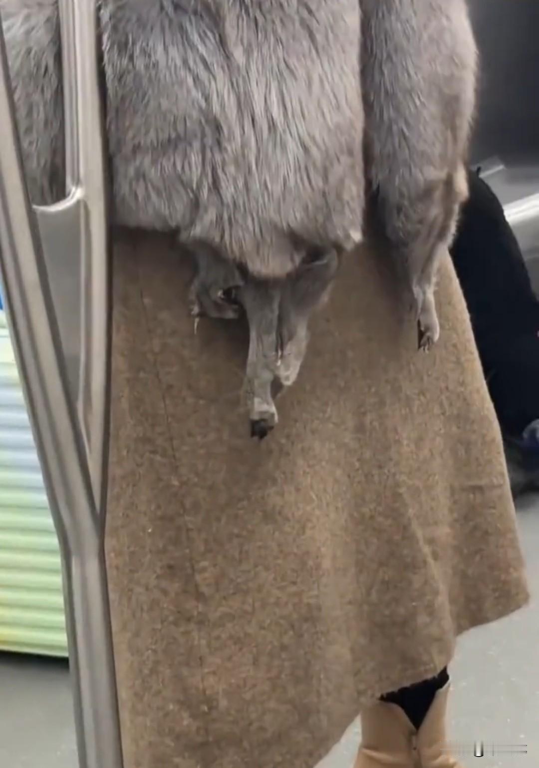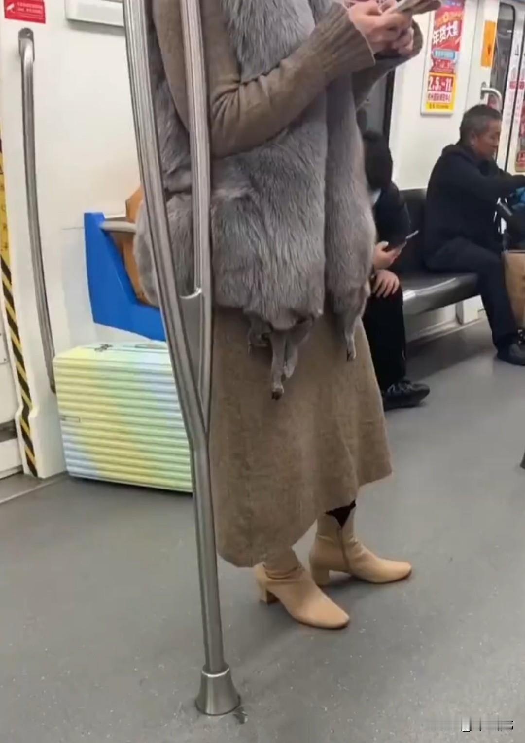 女子穿着皮草坐地铁,令人瞠目结舌的是,她这件灰色的皮草马甲,下摆竟然还垂着几条狐狸脚。 这才是真正的、如假包换的动物皮草吧,穿上去是不是特有面子。 但我觉得,那几条晃悠悠垂着的狐狸脚,越看越觉得渗人,毫无一点美感。 夜晚睡觉时挂在床前,会不会做噩梦。 真有这么变态的皮草吗,生怕人家不知道是狐狸皮做的。 弱弱地问一句,穿得起皮草的人,还用得着跟普通人一样挤地铁吗?