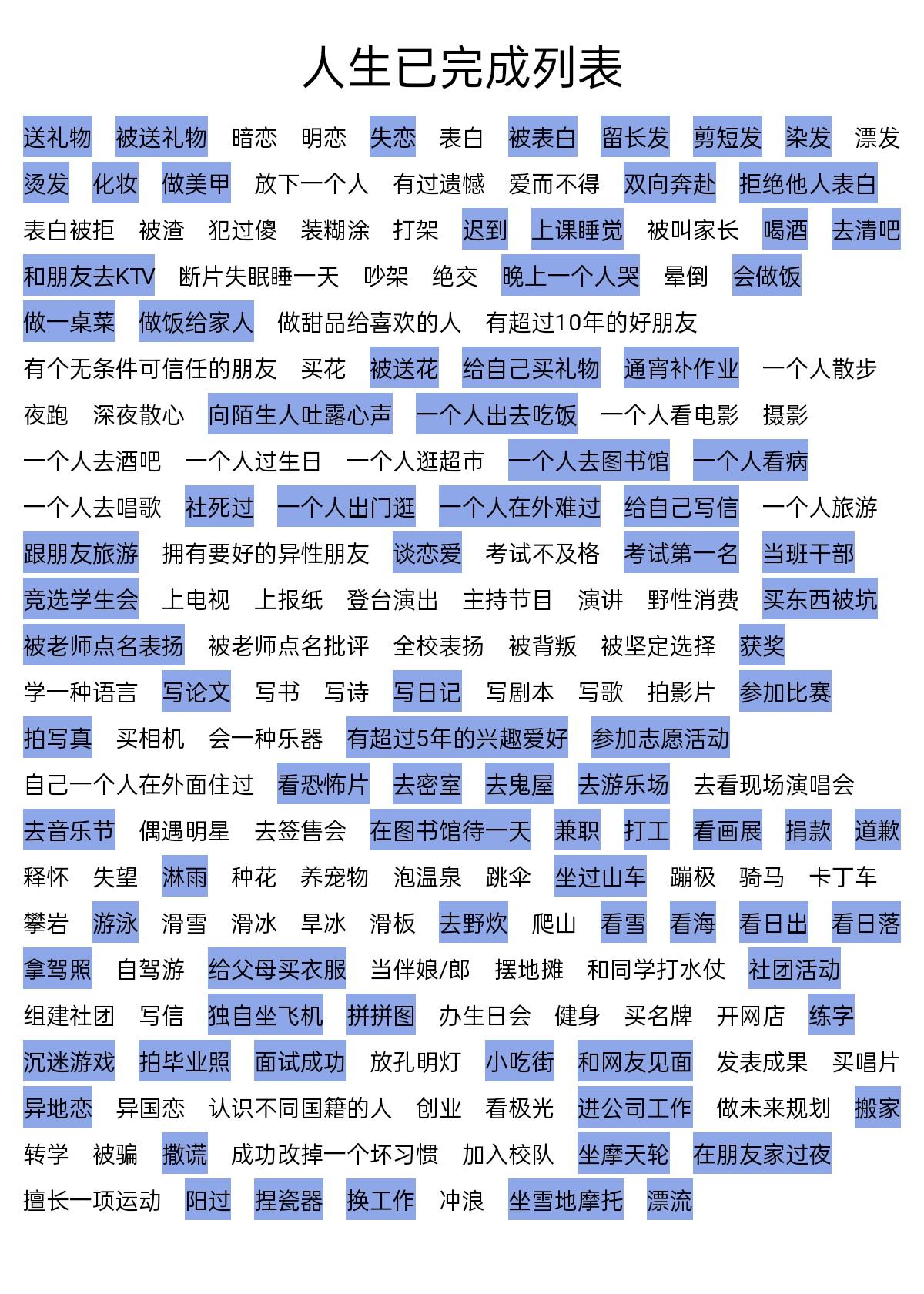 人生清单大挑战人生必体验清单 挖到一份超全的人生已完成清单,挨个勾完我直接惊了,原来这些年悄悄经历了这么多事! 从送礼物、被表白的心动,到熬夜补作业、一个人看病的孤单;从登台演出的紧张,到被坚定选择的温暖,每一项都是不同的人生碎片。 宝子们快来对照着填一填,评论区晒晒你们勾掉了多少?看看谁的人生体验感拉满,又有哪些事还在待解锁清单里~